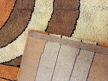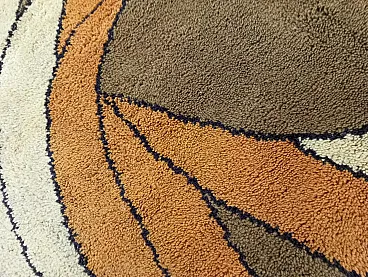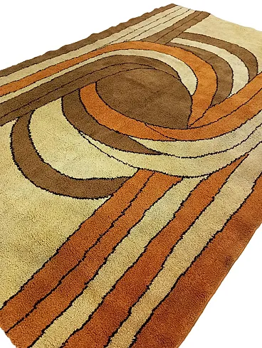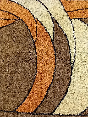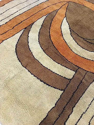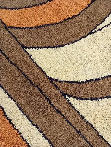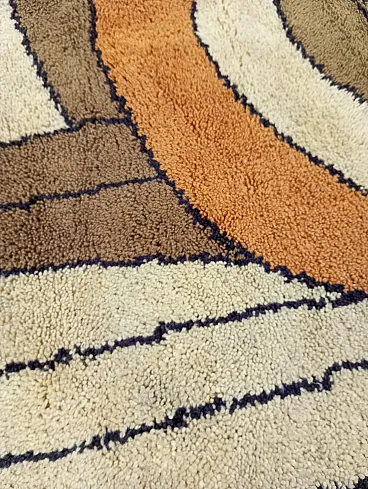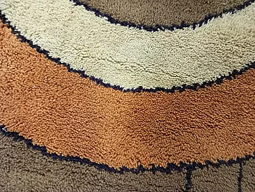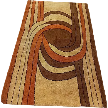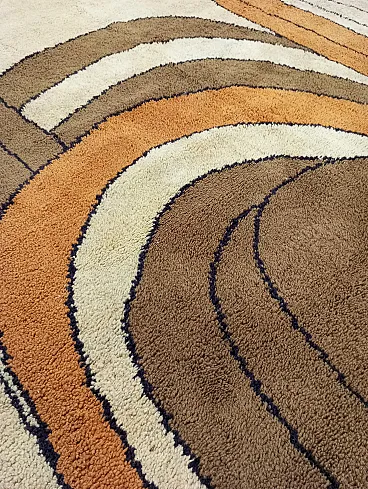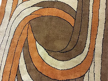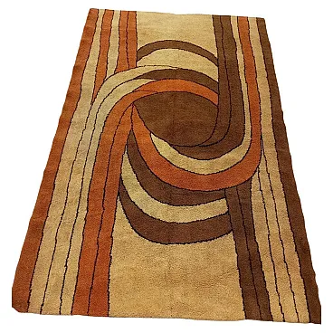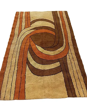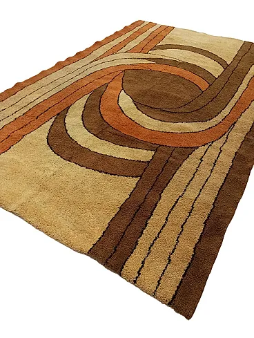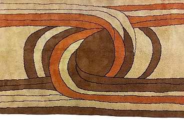 Tappeto di design moderno con dimensioni 287 cm. x 186 cm. prodotto negli anni ’60. I suoi toni sfumano dal beige chiaro fino al marrone scuro, con un effetto elegante, il design è formato da linee che s’intrecciano al centro. Il colore si distribuisce sul fondo beige, creando una base rilassante, mentre le linee sono delineate da un marrone più scuro alternati per creare contrasto e profondità. Il gioco di linee si alternano in modo da dare al tappeto un aspetto dinamico ma ben bilanciato. Lavorato a macchina con lana acrilica. Italia 1960. Tappeto vintage “Textile road” dei designers Austriaci Gretl e Leo Wollner, noti per i lori disegni tessili tra gli anni ’50 e ’90.