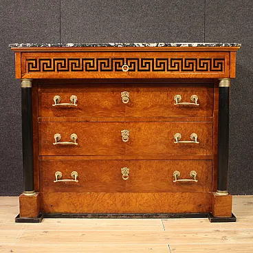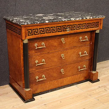 Italian dresser from the second half of the 20th century. Empire style furniture veneered in briar and ebonized wood with beautiful lines and pleasant decor. Chest of drawers equipped with four spacious drawers and original marble top of good size and service. Base dresser ideal for placing in a bedroom or living room, for antique dealers and interior designers. Cabinet adorned with ebonized front columns and fret placed under the top (see photo). Dresser which is part of a complete set of bedside tables (see photo and request the bulk price, if available). Structurally sound and complete with working keys, it shows some small signs of wear, overall in a good state of conservation.