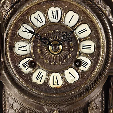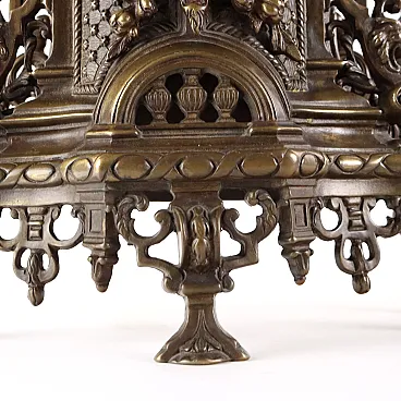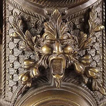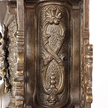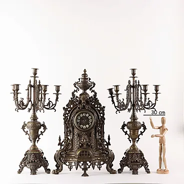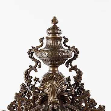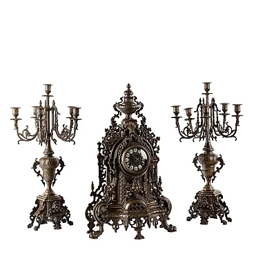 Triptych clock in bronze with decorations of plant motifs, shells and masks. Candelabra with six flames with arms with leafy scrolls. Mechanism marked FHS Germany.
