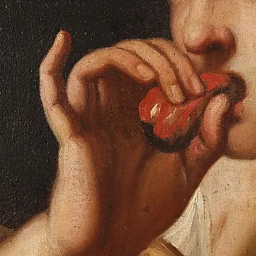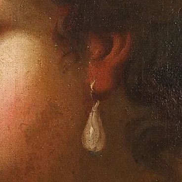 Oil on canvas. The woman depicted in the scene can be traced back to Porzia, the Roman noblewoman and wife of Brutus, who lived in the 1st century BC: according to legend, she committed suicide by swallowing a burning coal, and it is in this fatal moment that she is depicted here. The painting is very close to the pictorial methods of the painting of the same name from the Cignani school, attributed to his pupil Marcantonio Franceschini and preserved at Palazzo Tozzoni in Imola. The figure of Porzia, placed in an interior with classical elements, occupies the entire field of the scene, and is depicted sitting in front of the burning brazier, in the act of putting the coal in her mouth; her expression reveals the suffering of the gesture she is making, but also her determination, her gaze looking into the distance already places her far from the life she is leaving. The painting has been restored and relined. It is presented in an antique 18th century frame.
