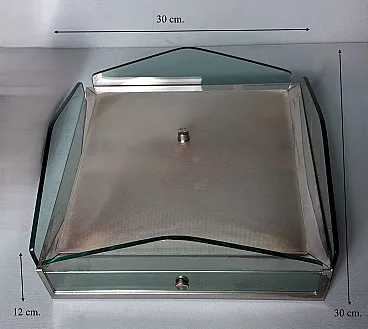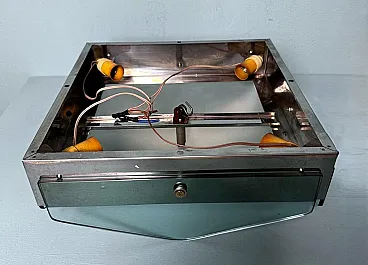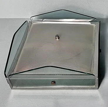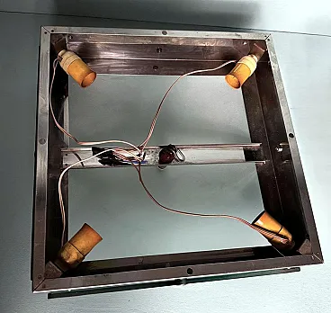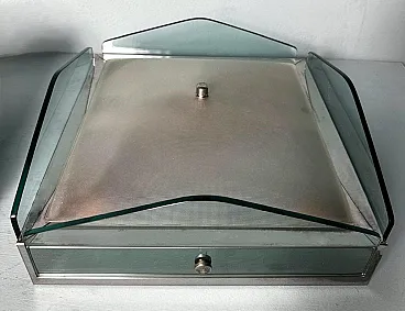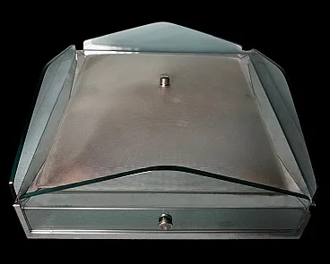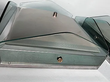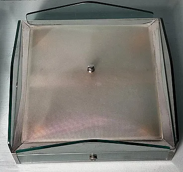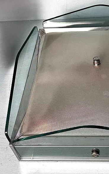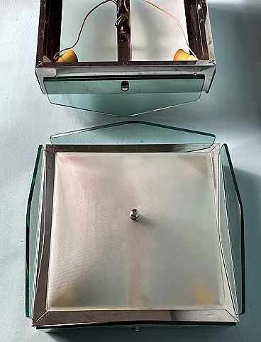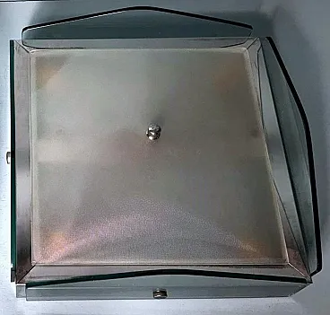 This iconic pair of ceiling lights, crafted from metal and thick glass, features a square, chrome-plated metal frame. The shaped glass elements attached to the sides are made from thick, ground glass with beveled edges; the central square glass panel is opaque, satin-finished, and slightly domed, allowing for an even light diffusion. Inside the frame, the lamp holders are positioned in each corner, and a crossbar houses the electrical wiring along with the attachment mechanism for ceiling installation. This pair was crafted between 1965 and 1969 in an artisanal workshop on the outskirts of Milan. Like many small industry operators, the workshop functioned independently while also producing items for the Veca Company. However, they were not permitted to affix Veca's trademark or label to the pieces, as Veca would handle labeling once the products returned to the company. This system was very common in the Lombard production of various items, as it allowed for efficient scheduling and cost control without sacrificing quality. Veca, like other companies adopting this approach, employed some of the most skilled artisans available. The Veca style aligns with the Space Age aesthetic, distinguished by clean lines and minimalist forms typical of Italian design from that era. Observing these ceiling lights, one immediately notices the linear, understated design, with the geometric style characteristic of Veca's minimalist approach. Veca ceiling lights, like these, were crafted primarily from thick glass and chrome-plated metal, with matte, frosted glass allowing for soft, even light diffusion. Veca and its external artisans operated mainly in the 1960s and 1970s, a period marked by the postwar boom in Italian design. Veca designs were recognized for their geometric, essential style, perfectly in tune with the "Modernist" and "Space Age" trends of the time. Their techniques involved meticulously handcrafted processes, giving each piece a unique, high-quality finish. Many Veca items are now considered collectible, and highly prized by vintage and modernist design enthusiasts. Veca's ability to merge glass and metal into modern, sculptural forms made its lamps and accessories distinctive, adaptable pieces suitable for various settings. Thanks to these qualities, Veca became an iconic brand. Today, although production has ceased, its pieces remain highly sought after by collectors of vintage design. Our ceiling lights are not only functional décor items but also examples of sophisticated style. Elegant, precise, and functional, they create warm, moonlit, shaded, and enveloping atmospheres, offering a fresh perspective to any onlooker. We kindly invite you to read the full description, as we aim to provide detailed technical and historical information to ensure the authenticity of our items. This iconic pair of ceiling lights, crafted from metal and thick glass, features a square, chrome-plated metal frame. The shaped glass elements attached to the sides are made from thick, ground glass with beveled edges; the central square glass panel is opaque, satin-finished, and slightly domed, allowing for an even light diffusion. Inside the frame, the lamp holders are positioned in each corner, and a crossbar houses the electrical wiring along with the attachment mechanism for ceiling installation. This pair was crafted between 1965 and 1969 in an artisanal workshop on the outskirts of Milan. Like many small industry operators, the workshop functioned independently while also producing items for the Veca Company. However, they were not permitted to affix Veca's trademark or label to the pieces, as Veca would handle labeling once the products returned to the company. This system was very common in the Lombard production of various items, as it allowed for efficient scheduling and cost control without sacrificing quality. Veca, like other companies adopting this approach, employed some of the most skilled artisans available. The Veca style aligns with the Space Age aesthetic, distinguished by clean lines and minimalist forms typical of Italian design from that era. Observing these ceiling lights, one immediately notices the linear, understated design, with the geometric style characteristic of Veca's minimalist approach. Veca ceiling lights, like these, were crafted primarily from thick glass and chrome-plated metal, with matte, frosted glass allowing for soft, even light diffusion. Veca and its external artisans operated mainly in the 1960s and 1970s, a period marked by the postwar boom in Italian design. Veca designs were recognized for their geometric, essential style, perfectly in tune with the "Modernist" and "Space Age" trends of the time. Their techniques involved meticulous handcrafted processes, giving each piece a unique, high-quality finish. Many Veca items are now considered collectible, highly prized by vintage and modernist design enthusiasts. Veca's ability to merge glass and metal into modern, sculptural forms made its lamps and accessories distinctive, adaptable pieces suitable for various settings. Thanks to these qualities, Veca became an iconic brand. Today, although production has ceased, its pieces remain highly sought after by collectors of vintage design. Our ceiling lights are not only functional décor items but also examples of sophisticated style. Elegant, precise, and functional, they create warm, moonlit, shaded, and enveloping atmospheres, offering a fresh perspective to any onlooker. The pair is in good condition. The original electrical system, in working order, has European wiring from the period, so an inspection or replacement is recommended—a straightforward procedure, given the minimal wiring involved. Measurements of each ceiling light: width 30 cm, length 30 cm, height 12 cm. For all shipments, we use special packaging materials (wooden crates, Styrofoam, etc.) to ensure the highest level of protection and safety for each item. . Measurements of each ceiling light: widt