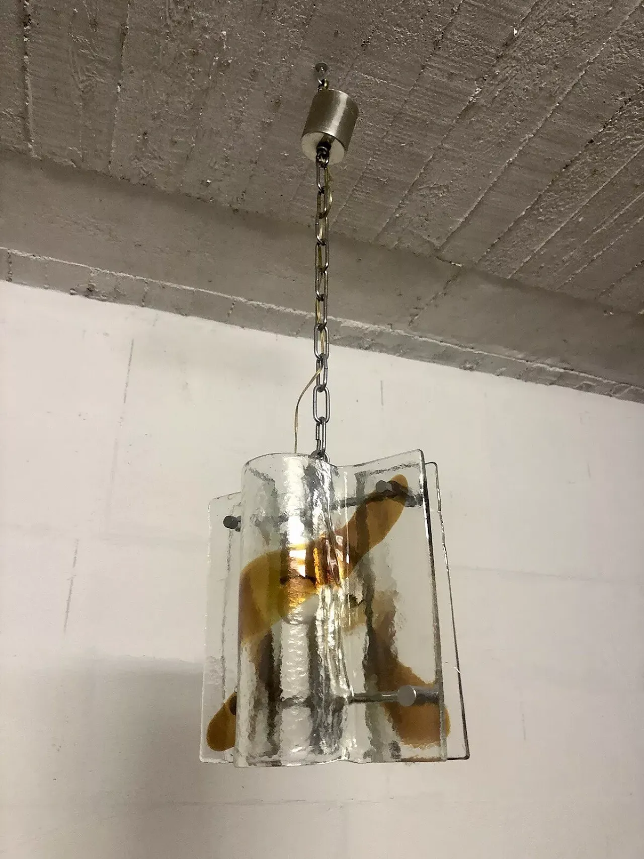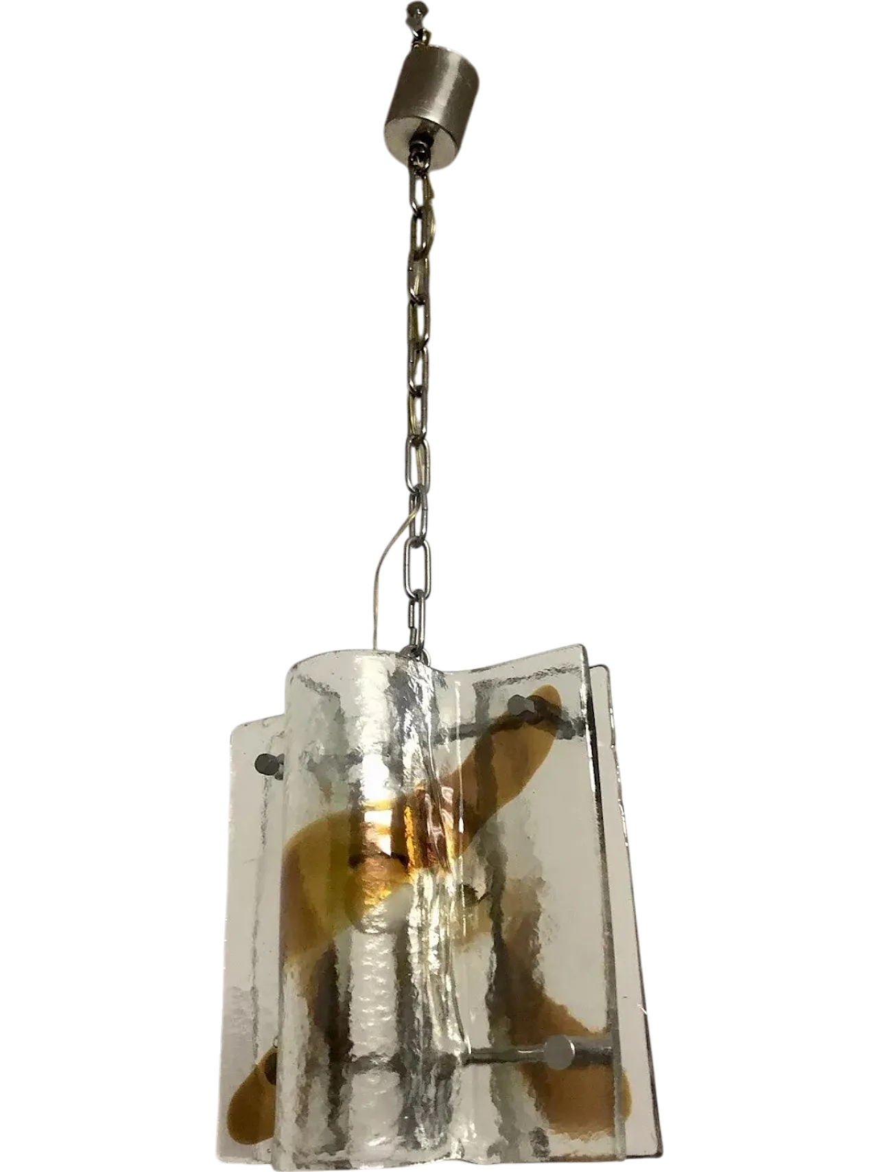 Vintage 70s Murano glass chandelier, Mazzega model. The structure is in chromed steel with light and amber glass tiles. With 2 lights. Object of great visual impact. Complete in all its parts. Small signs of wear due to age (over 50 years).