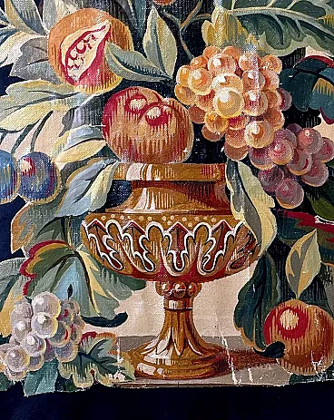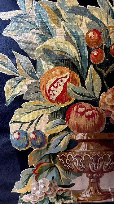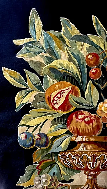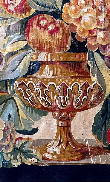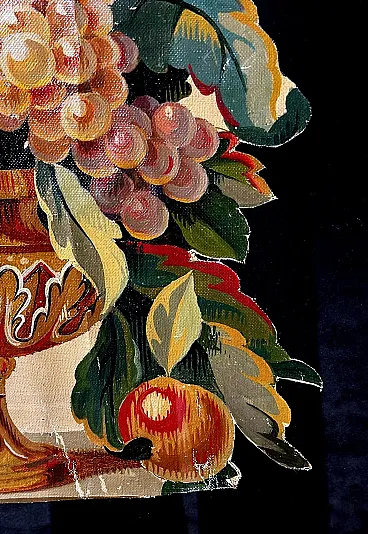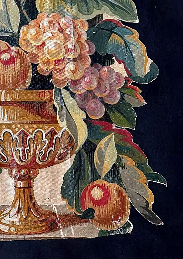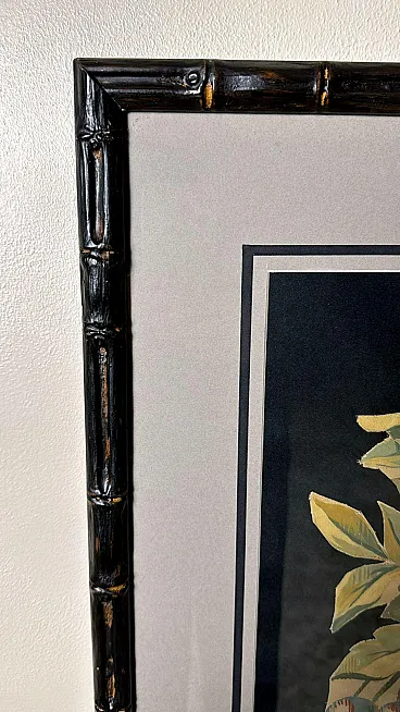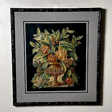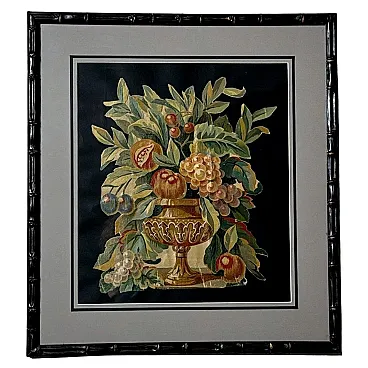 This frame encloses a canvas cutout from an antique oil painting and is particularly unique and distinctive. It was recently crafted by a Florentine Master cabinetmaker whose workshop is located in the most charming and vibrant district of Florence, San Frediano, renowned for its artisan shops that produce entirely handmade works. The Master used carved and shaped wood to replicate the appearance of bamboo, employing a technique known as "faux bamboo." This process involves using durable woods, such as maple or oak, that are intricately carved and then painted to achieve the desired effect. The "faux bamboo" technique has a history that dates back several centuries and gained significant popularity during the 18th and 19th centuries in Europe and America, eras marked by a fascination with exotic and Oriental design influences. This technique was particularly associated with the Chinoiserie style, an artistic movement inspired by Chinese art and aesthetics. At the time, real bamboo furniture and decorative objects were highly sought after but often difficult to obtain. To meet the increasing demand, artisans developed the faux bamboo method to replicate the look of bamboo using more readily available materials like wood and metal. The framed canvas cutout is part of a work in the European painting tradition (probably France) from the late 18th to early 19th century (circa 1790-1810), drawing inspiration from the Rococo or Neoclassical styles. These styles are characterized by intricate, ornamental details, elaborate compositions, and the use of natural motifs such as flowers and fruits to evoke beauty and abundance. The depicted scene features an artistic arrangement of natural elements presented in a harmonious and detailed composition. A decorative golden vase with ornate trim takes center stage, overflowing with lush fruits and foliage. The scene is rich in warm, vibrant colors, with shades ranging from green leaves to red and yellow fruits, including clusters of grapes and other naturalistic elements. The skilled use of shading and highlights creates depth and realism, reminiscent of the refined techniques employed by the masters of the period. The modern frame that houses this piece of antique art provides a captivating contrast between past and present, making it ideal for sophisticated spaces, whether classic or contemporary. The addition of black cardboard as a background accentuates the canvas's details, enhancing the play of light and shadow and adding an elegant, distinctive touch to the overall composition. This blend of elements presents a rare opportunity to own a piece of artistic history, seamlessly adapted to modern tastes. This item is not just a decorative piece but a work of art that embodies the elegance of historical painting and demonstrates how art from the past can enrich contemporary interiors. The framed cutout serves as a striking focal point, perfect for adorning living rooms, studies, or entryways, bringing an air of elegance and timeless artistic value. The frame is in perfect condition, while the canvas cutout shows natural signs of aging. Measurements: width 64 cm, height 70 cm, depth 3 cm.