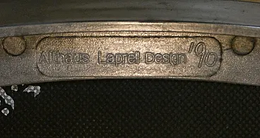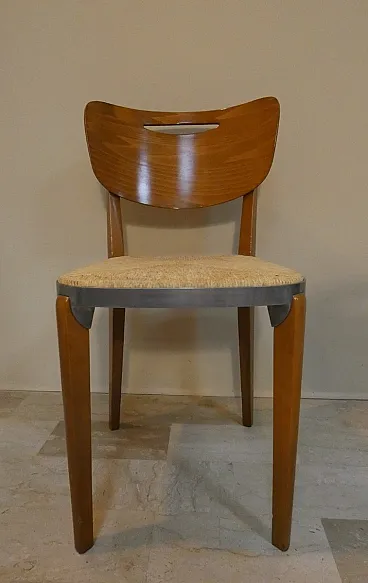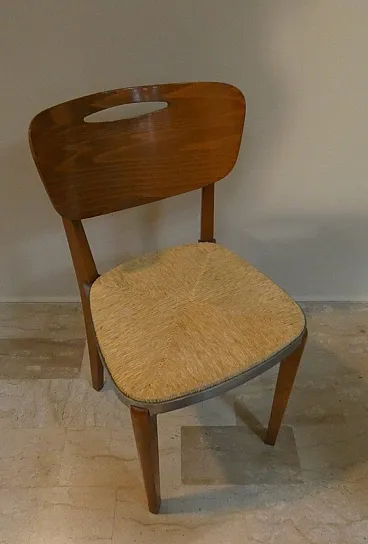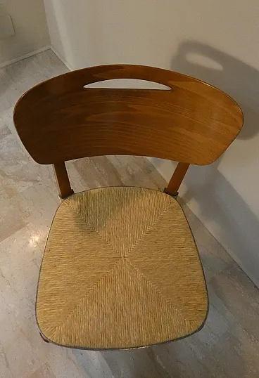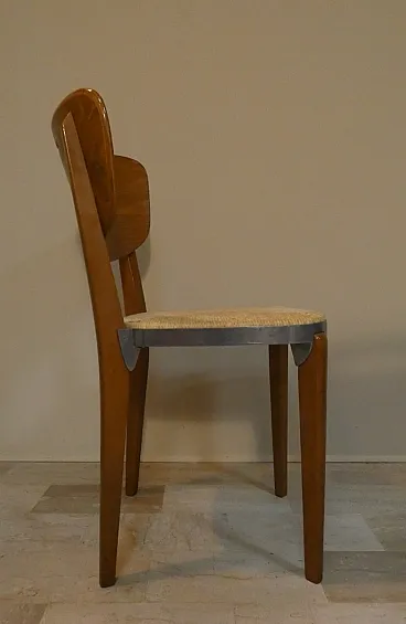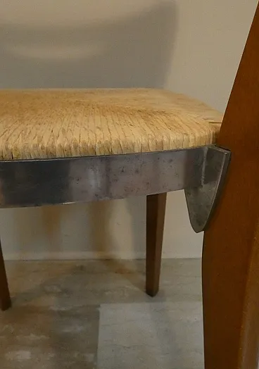 Chair with natural beech structure; curved backrest in polished plywood; seat in die-cast aluminium, straw with knot in the centre, natural. Front legs shaped with a square section, with slight flaring and curvature near the supports; the rear legs replicate the same section, with an increase in depth near the seat structure. The legs are fixed to the rest of the structure via a particular metal joint and screw to the seat intrados. Seat structure, leg joints and steel screws, with contrasting colour. Thomas Althaus (Düsseldorf, 1967) began his career in 1987, after graduating in interior architecture and design from the University of Düsseldorf. from 1989 to 1994 he collaborated with the design studio of Volker Laprell, interior architect and designer. Together they designed the "Online" office furniture collection for the German company Rosenthal in 1992, which was awarded several awards the following year (Red Dot Design Award).