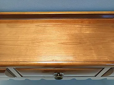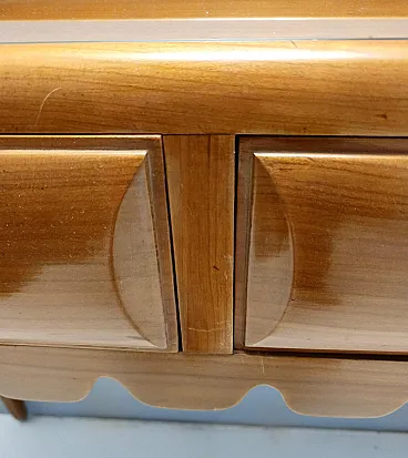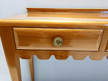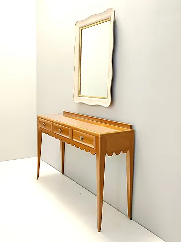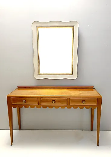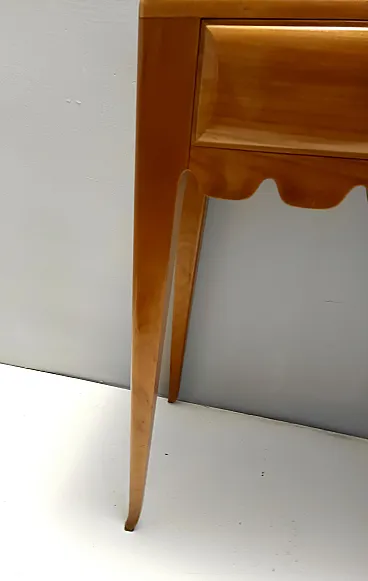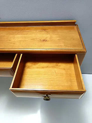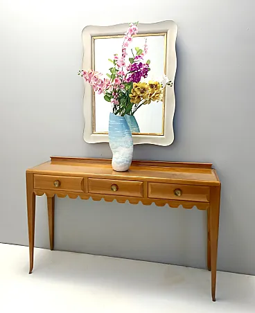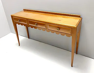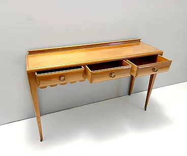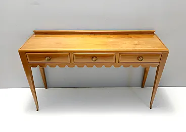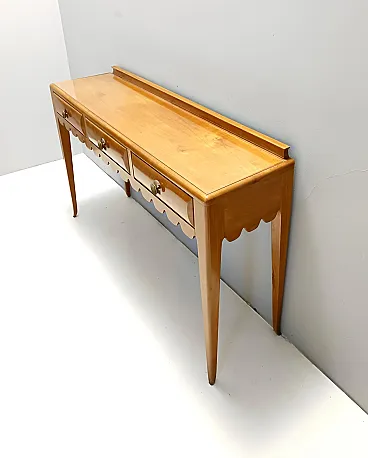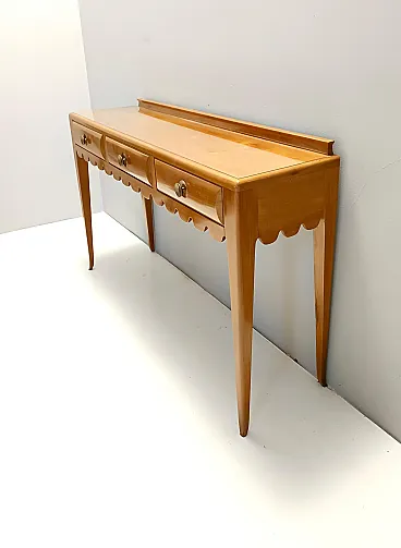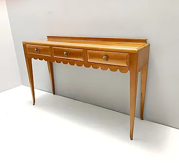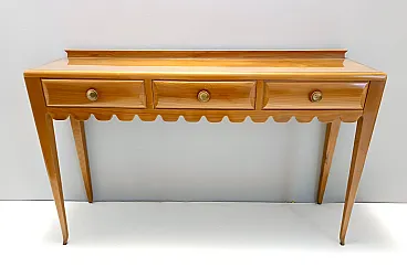 Made in Italy, 1948 - 1950. This refine and elegant console table features a glass top, a solid cherrywood frame with three drawers and brass handles. This piece is vintage, therefore it might show slight traces of use such as its original patina, but overall it can be considered as in excellent original condition and ready to become a piece in a home. It is published and it the first time this piece is seen on the marketplace. Literature: "Il mobile italiano degli anni '40 e '50", Irene de Guttry, Maria Paola Maino, pp. 116-117. Measures: Width 150 cm Depth 42 cm Height to the top 90 cm Height to the edge 94 cm. Order it now! We sell the best quality pieces and we offer an amazing service: if it's not during night time, we answer within 2 hours and we absolutely love to follow every step of the purchase and even after. As matter of fact we really appreciate our customers’ feedback and when we receive pictures of our pieces in their new homes. We assist you during the process and answer all your questions. In addition to this, we always review the pieces before shipping, so that you receive the goods at its very best. We provide the best possible quotes and professionally and carefully pack the items. Insurance is included. And if there is any issue, it is our mission to make so you don't have to worry: we will always be there for you to assist in any way possible.
