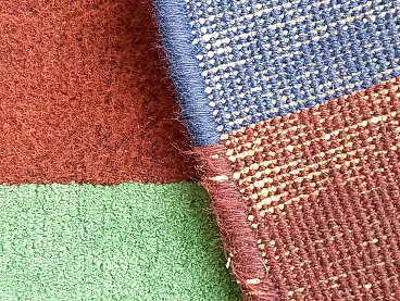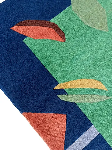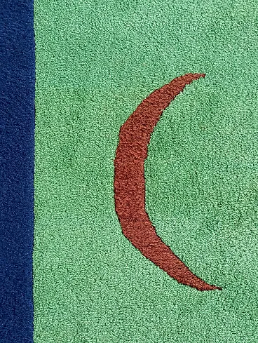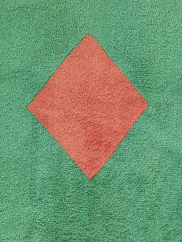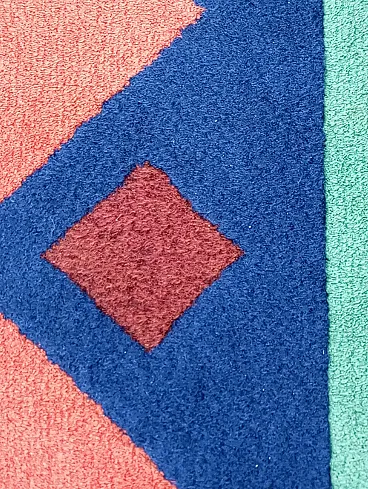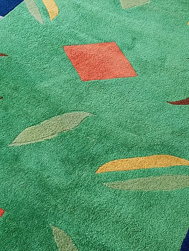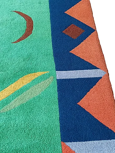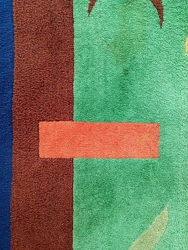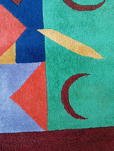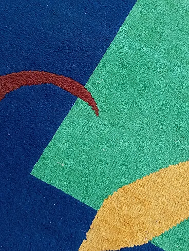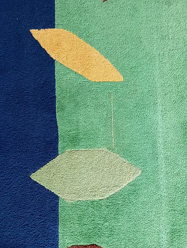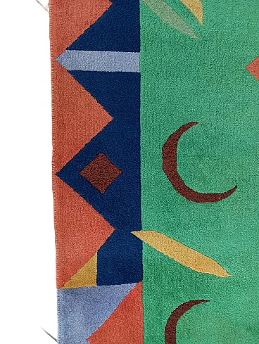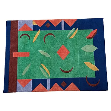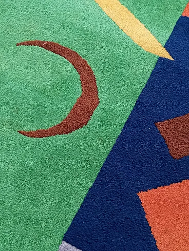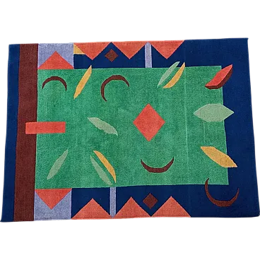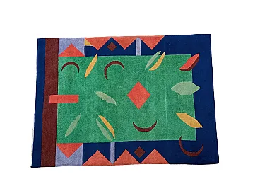 Vintage 1990s abstract design rug, size 235 cm- x 174 cm. This rug perfectly represents the bold style of the 1990s, with an aesthetic that recalls the abstract art of Sonia Delaunay, famous for her geometric compositions and innovative use of color. It features geometric and abstract shapes - lines, rhombuses, triangles, which create a dynamic and harmonious visual rhythm. The main colors, green, blue and ochre, were chosen to create a balanced and vibrant contrast typical of the color trends of that decade. Knotted entirely by hand in fine wool, the rug features a dense, soft weave that not only provides depth and warmth, but also enhances the colors, bringing out the intensity of the tones. The quality of the handwork highlights each knot, giving the rug a handcrafted and durable look.