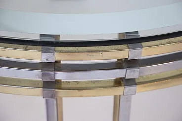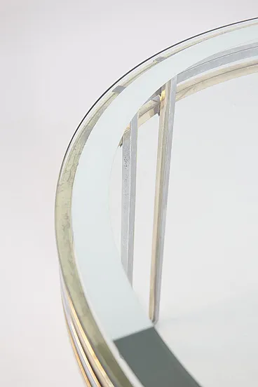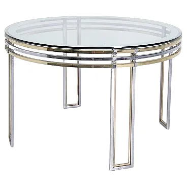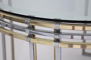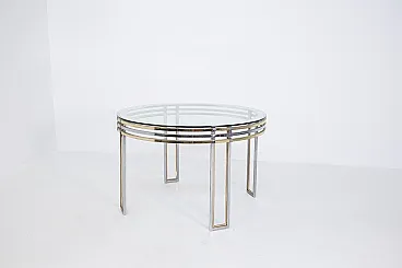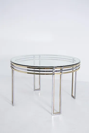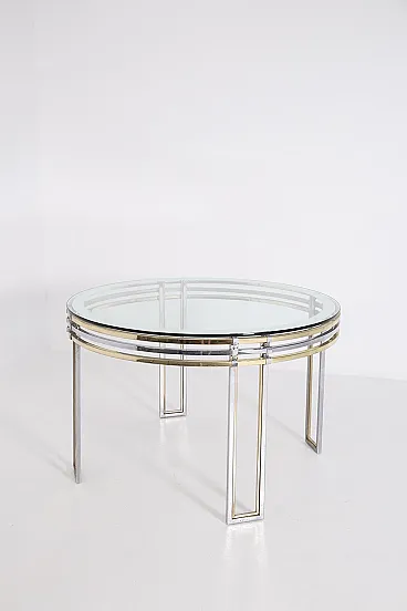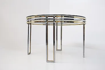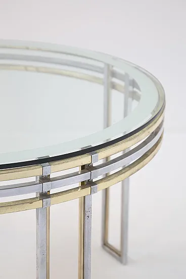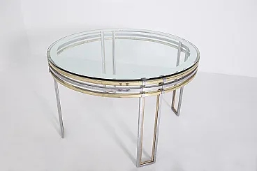 Italian geometric round table from the 1970s, Space Age style, designed by Romeo Rega. This dining table is a masterpiece of design that combines high-quality materials with a bold, modern aesthetic. The table frame is composed of steel slats and gold-plated steel, elements that give the table a sophisticated elegance and formal rigor that catches the eye. The sharp lines and sharp contrasts between the gray and golden steel create a striking visual effect, making the table seem like a true architectural element within the space. The sturdiness and solidity of the structure are balanced by the lightness of the table top, made of thick transparent glass from the period. Its perfectly circular shape enhances the clean lines and adds a sense of lightness due to the transparency of the glass, which allows light to filter through and amplifies the perception of space. This round table is ideal for modern and contemporary environments, thanks to its clean and rigorous forms that make it an extremely versatile design element. Its small size makes it perfect for smaller rooms, where it can serve as an elegant focal point without weighing down the room. Romeo Rega's design, known for its innovative approach and use of fine materials, makes this table not only a functional piece, but also a style statement that enriches any room.