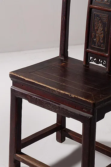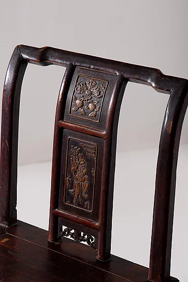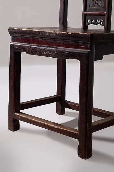 This chair from the late Ming dynasty represents an exceptional example of the art and craftsmanship that characterizes the Ming style. Side chairs, or chairs without arms, appeared during the Song dynasty and maintained a simple, unchanging form through successive dynasties, up to the Qing dynasty. Although they were likely the most common type of chair, their less sturdy structure compared to those with armrests led to the survival of fewer examples. The traditional term "lamphanger chair" (deng'gua yi) appears in texts from the Yongzheng period (1722-1735) and is still used in China today to describe these chairs. This type of seating, while less structured than others, was characterized by a simple and functional design, making it a common element in Chinese homes. Crafted from dark wood, the chair exudes an air of elegance and authority. The straight, square-sectioned legs provide a stable and sturdy base, while the backrest, though straight, features a slight curve at the top to enhance comfort. The intricate carvings on the backrest, executed with great skill, add a touch of sophistication, highlighting the care and precision that define the furniture of this period. A particularly fascinating detail of this chair is the carvings depicting two main figures: the lower one represents a man holding a plant from which Chinese wén coins grow, symbolizing prosperity. Above it, peaches can be seen, a lucky fruit in Chinese tradition that represents longevity. These symbols, combined, give the chair a profound auspicious meaning. This chair is not just a piece of furniture but a tangible witness to the rich Chinese artisanal tradition. Its design reflects both the aesthetic sensibilities of the Ming dynasty and the functional considerations that made it a popular choice. With its imposing presence and inherent cultural value, this chair is a work of art that enriches any space with its history and significance.