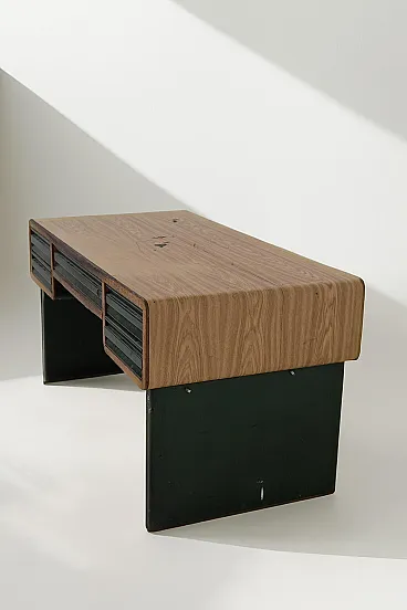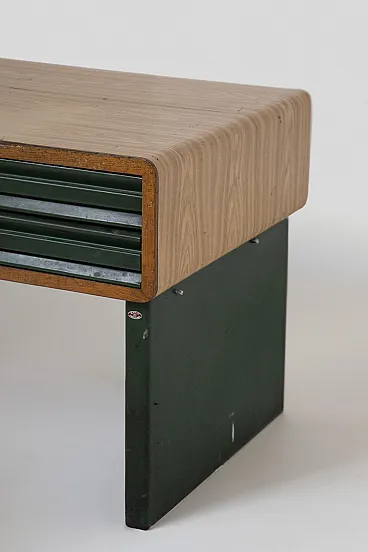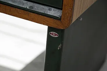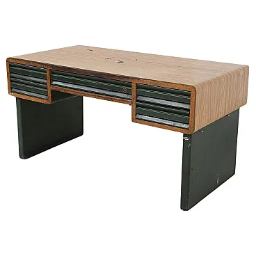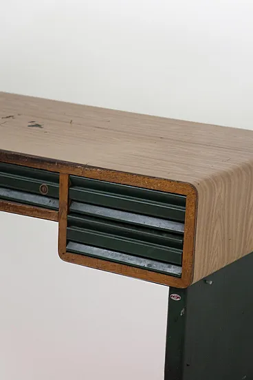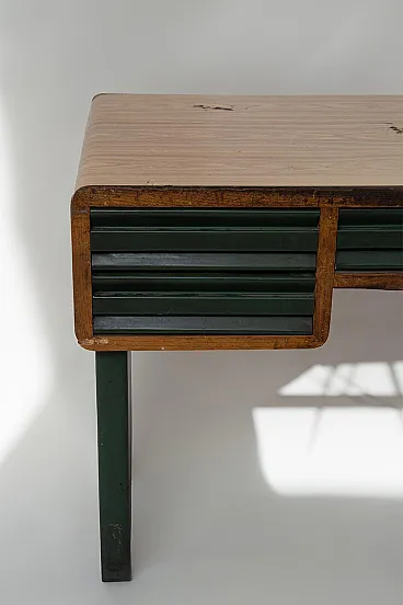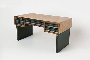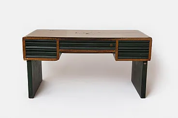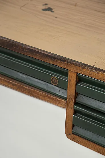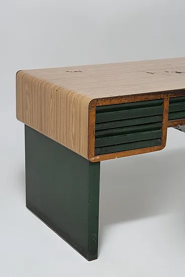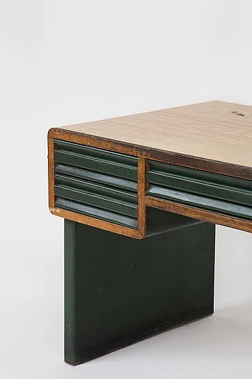This extraordinary desk from the 1930s, part of the prestigious collection of Maurizio Marzadori, one of Italy's most prominent collectors of Rationalist design, is a unique and unrepeatable piece, with a history rooted in the heart of Italian Rationalism. Originating from the selection of furniture that was to be exhibited at the renowned Hotel Cà Pisani in Venice, this desk represents a rare example of industrial design that seamlessly combines aesthetics, functionality, and history. The green-painted steel legs, bearing the mark "Sapic 22 Proclamation," are a testament to the industrial craftsmanship of an era when design was pushing new boundaries. The green steel drawers and the wooden top, with its warm grain, create a fascinating contrast between cold and natural materials, giving the piece a unique personality. The skillful pairing of steel and wood reflects the vision of a time when innovation was at the core of design thinking. What makes this desk even more valuable is the fact that the manufacturing factory likely no longer exists, as many companies had to close during the Second World War. This detail makes the piece not only rare but possibly unique, giving it an invaluable significance, transforming it into a true testimony of a bygone era. Every detail, from the branded legs to the combination of materials, makes this desk not just a piece of furniture but a genuine masterpiece of Rationalist design, now impossible to replicate. A rare opportunity for collectors and anyone looking to own a piece of history, this desk embodies the very essence of industrial design and craftsmanship from a time that will never return.