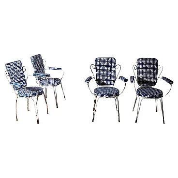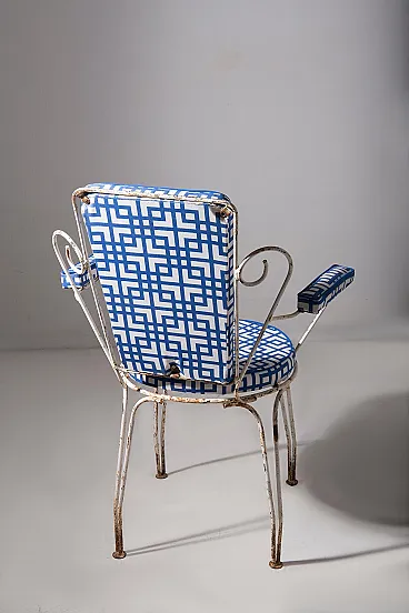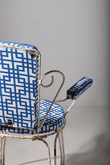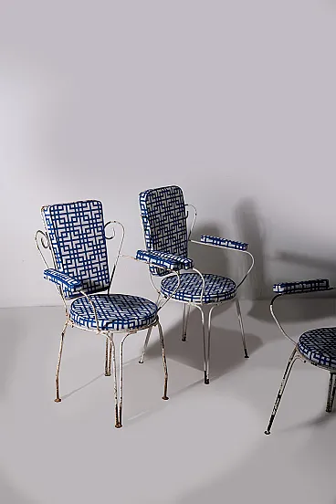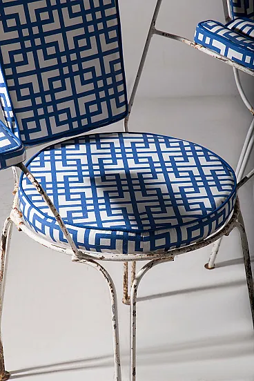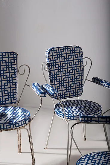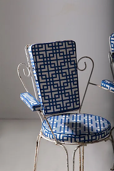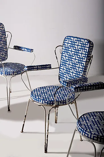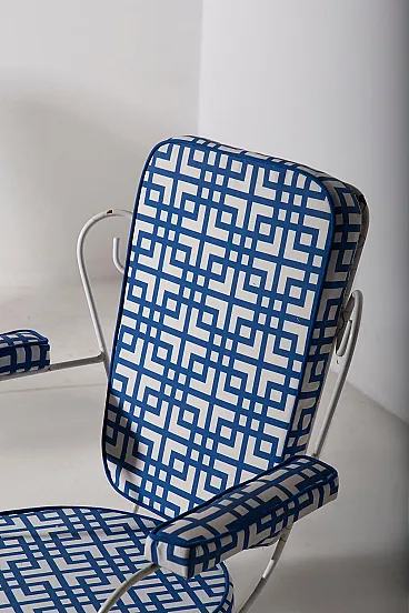 This charming garden seating set, made for **Casa e Giardino**, represents an iconic example of mid-20th century Italian craftsmanship. During those years, **Home and Garden** was synonymous with elegance and quality, and this set is a perfect testament to that. The metal frames, with their refined and light lines, were designed for outdoor use, combining durability with timeless style. Completely reupholstered, the seats and backrests feature a geometric blue and white fabric, adding a contemporary touch while preserving the vintage charm of the chairs. The contrast between the slightly patinated metal and the freshness of the new upholstery creates a balanced ensemble, ideal for those seeking a piece of furniture that blends past and present. The sinuous shapes of the backrests and armrests evoke the refinement of mid-century design, while the thin yet sturdy legs ensure stability and long-lasting durability. This set, a symbol of an era when **Casa e Giardino** was at the height of its success, is perfect for enhancing gardens, terraces, or indoor spaces with a touch of history and style, while maintaining timeless elegance.