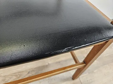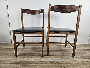 Six vintage 1970s Scandinavian/Nordic style dining room chairs in teak with black leather seats. Linear and modern structure that gives particularity to the chair allowing it to be combined with any type of furniture, from the most sophisticated to the simplest. The chairs are in the original patina, they show normal signs of wear due to age and use which guarantee their authenticity and tell of their past. Small holes/cuts on some seats as per photo.