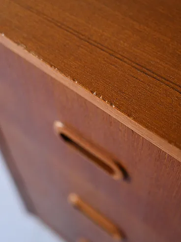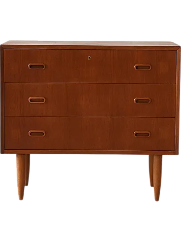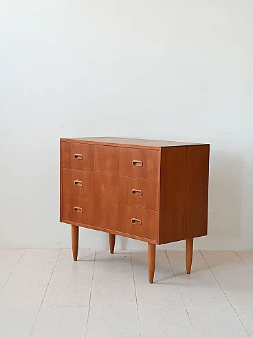 Scandinavian cabinet with three drawers of which the first is equipped with a lock. The teak structure with modern lines and the conical legs that slim the figure make it a piece of furniture suitable for different styles and environments. Good condition. It may show some signs of aging. Please pay attention to the photographs.