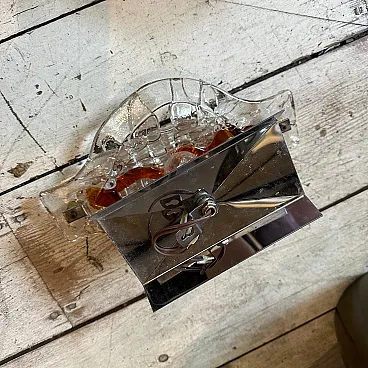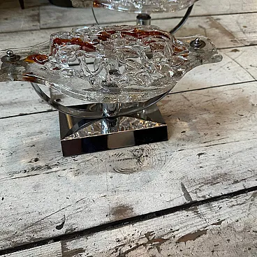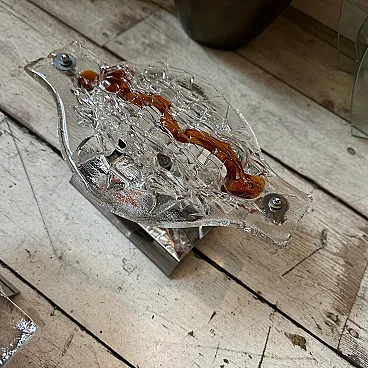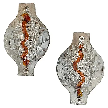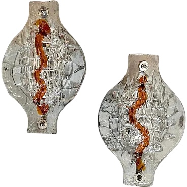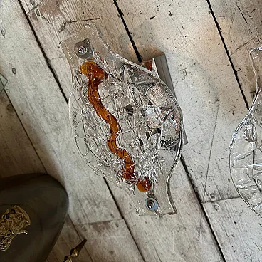 These Mazzega sconces are not just lighting fixtures but statement pieces, showcasing the fusion of art and utility that defines Murano glass craftsmanship. Their blend of bold Space Age design with warm, organic glass elements makes them timeless and collectible. These sconces are crafted with Murano glass, renowned for its exquisite artistry and quality. The combination of clear and brown glass demonstrates the signature Mazzega technique of fusing glass layers to create dynamic visual effects. The clear glass is paired with rich, smoky brown accents, which swirl or fade into each other seamlessly. This gradient effect enhances the light diffusion and gives the pieces a warm, atmospheric glow, these sconces softly diffuse light through the glass, casting intricate patterns on the surrounding surfaces. The brown tones add warmth, making the lighting effect both dramatic and cozy. These sconces softly diffuse light through the glass, casting intricate patterns on the surrounding surfaces. The brown tones add warmth, making the lighting effect both dramatic and cozy. Ideal for accent lighting in a retro-inspired space or as a unique contrast in a modern minimalist interior. Perfect for hallways, living rooms, or flanking a bed or fireplace, where they can be admired both as functional lighting and artistic decor. They are in very good condition overall and in working order.