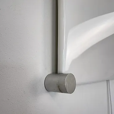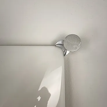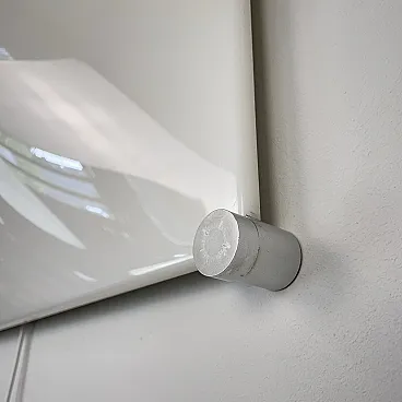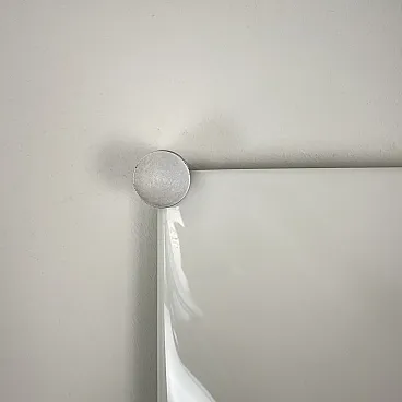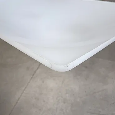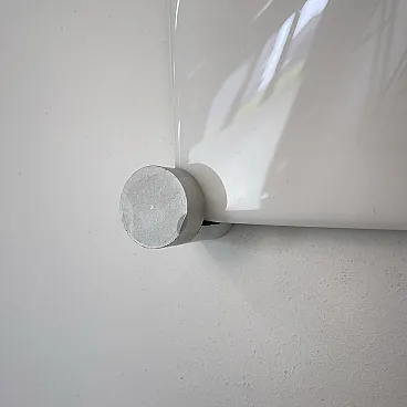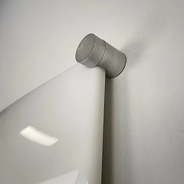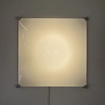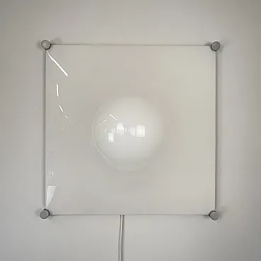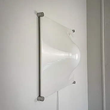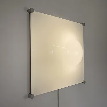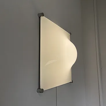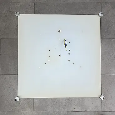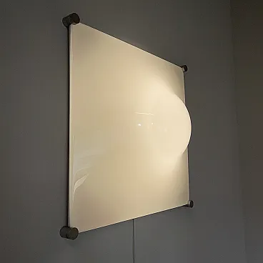 Ceiling light, wall or ceiling lamp. “Bolla” model by Elio Martinelli (Martinelli Luce), 1965. The manufacturer's label is present (see photographs). 60x60 cm version. Opal methacrylate diffuser. Rotating supports in anodized aluminum for fixing the diffuser. Methacrylate diffuser without scratches but with a small crack on the edge of one corner, crack not visible when installed (see photograph). The diffuser measures 60x60 cm, the overall dimensions of the lamp are 62x62 cm. To be used with standard E27 bulb. Compatible with LED bulbs. Bulb not included. (literature: Repertory 1950-1980, Gramigna, Mondadori, page 230)