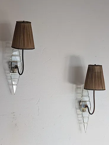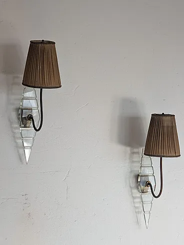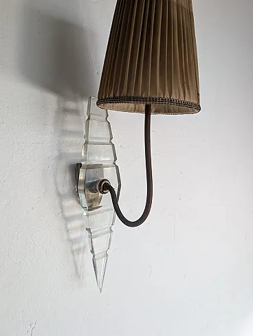 Set composed of 2 wall lights (€1000). 2 sets available, for a total of 4 lamps. Made from the most authentic materials available in the 40s, this wall light exemplifies Italian craftsmanship at its peak. Its classic design and rich detailing will add a touch of grandeur to any space, be it your living room or study. Immerse yourself in the allure of the bygone times as this wall light illuminates your world in its warm, comforting glow. The wall light structure is made of metal and Baccarat crystal. The wall light structure preserves its original patina, but - upon customer’s request and with an additional charge - it can be cleaned. The lampshade is made of haircloth. Haircloth is original, but - upon customer’s request and with an extra charge - it can be replaced with a new one. The item is preserved in good condition.