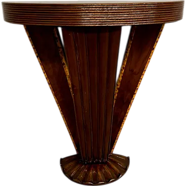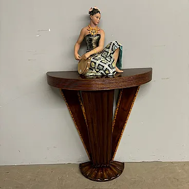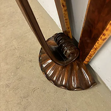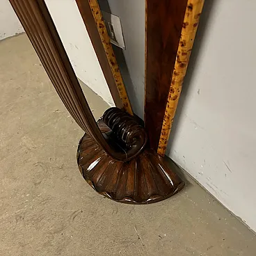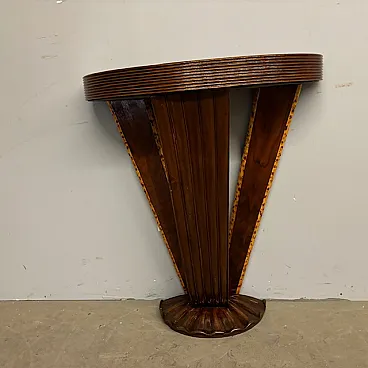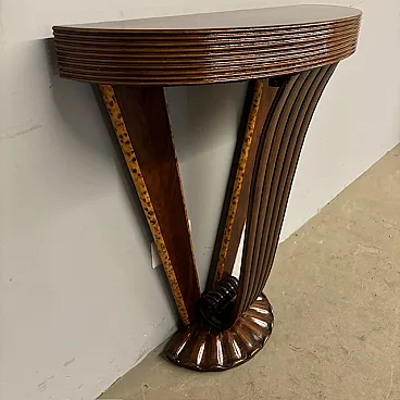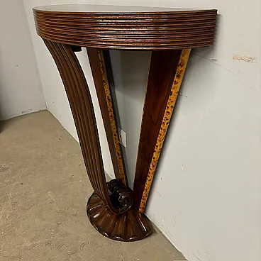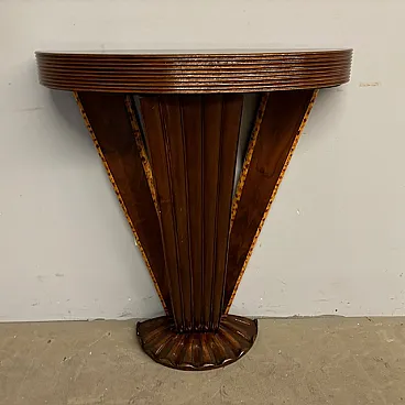 Ancient splendid walnut console of pure art deco taste from 1940, restored. with carved base. rear axles painted with fake briar. Size L 90 x d 27. 90 cm.