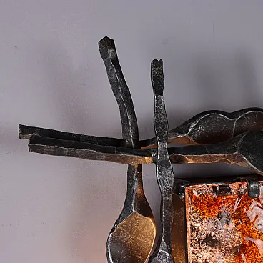 Set of four brutalist style wall lamps with wrought iron structure and worked polychrome glass.