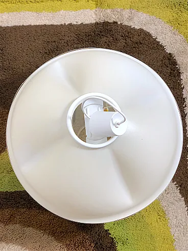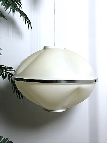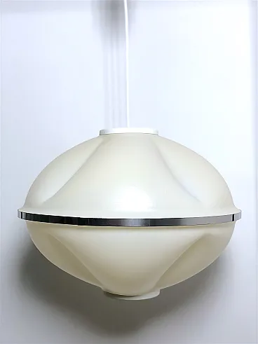 Space Age Chandelier 70s Made in Italy The chandelier is inspired by space and futuristic design, very popular in the 70s. The use of plastic material and modular shapes are a characteristic of the period called SPACE AGE. Made of ivory-coloured rigid plastic material, with a uniform texture that diffuses the light softly, there is a metal band halfway up the structure which adds an elegant and futuristic touch. PERFECT CONDITIONS Measurements: Chandelier height 40 cm - Diameter 55 cm - E27 fitting