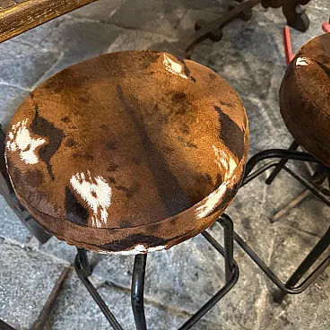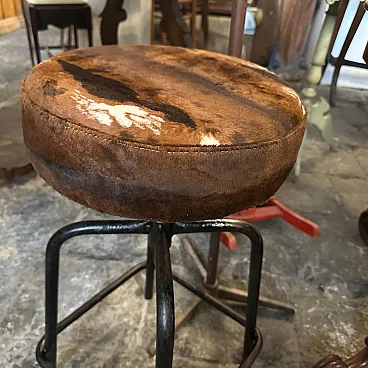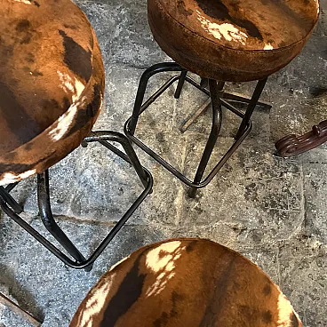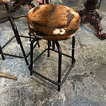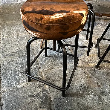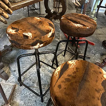 These are three 1950s Italian industrial footstools featuring adjustable heights and a robust design. They have sturdy iron frames, with legs that slightly flare out for stability, and footrests integrated into their design. The seats are upholstered with cowhide fabric with a warm, earthy brown and white pattern. This combination of materials gives them a rustic yet functional aesthetic, making them suitable for industrial or vintage-inspired interiors. They are in orginal intage condition, only the seat haave been recently upholstered.