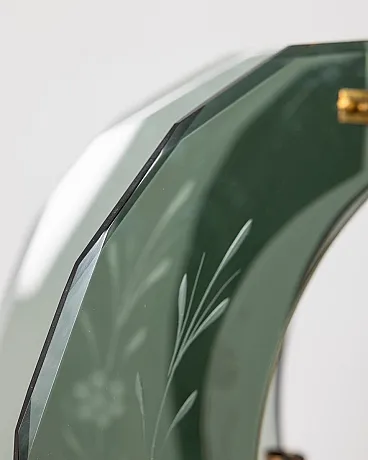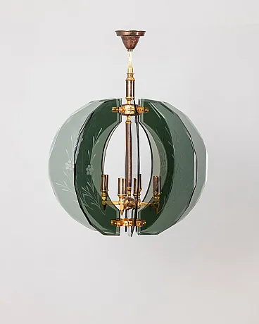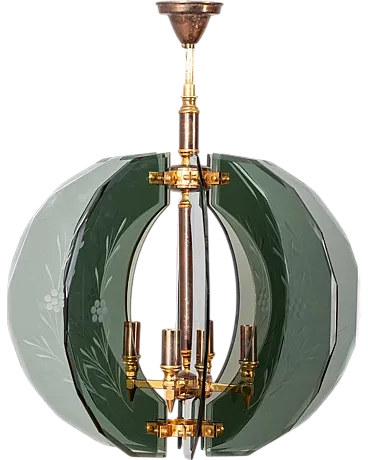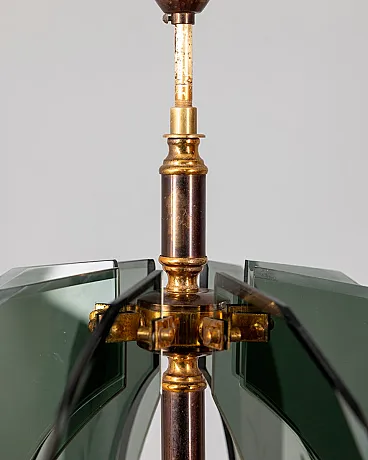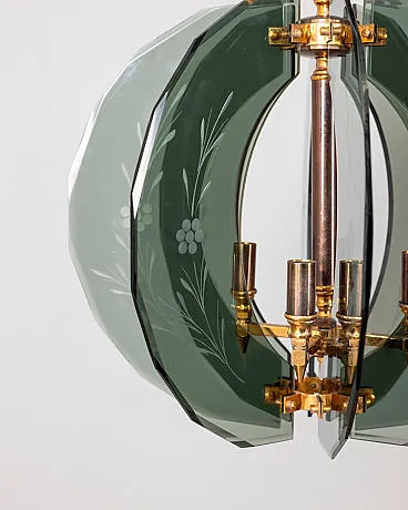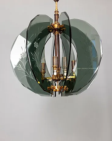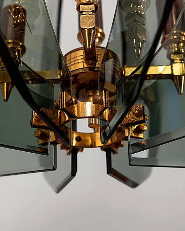 Four-light pendant light with golden brass structure and eight sheets of smoked glass with floral decorations, Italian design, 1950s.