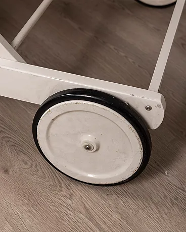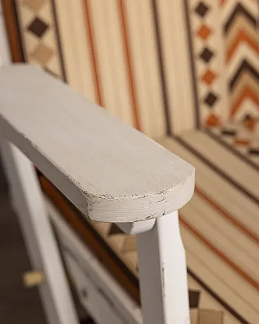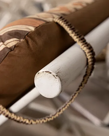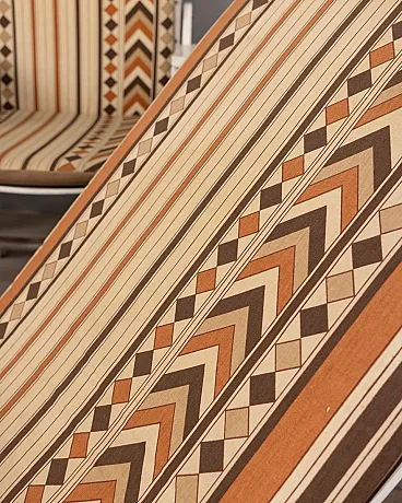 Set of two deck chairs, a deck chair and a trolley, the structures are in white painted wood, the deck chair cushions are covered in fabric designed by Clara Agnelli for Fratelli Reguitti, 1970s. Two deck chairs: Height 188 cm; Width 68cm; Length 65cm; A deckchair: Height 25 cm; Width 68cm; Length 192 cm; Trolley: Height 82 cm; Width 58cm; Length 100cm;