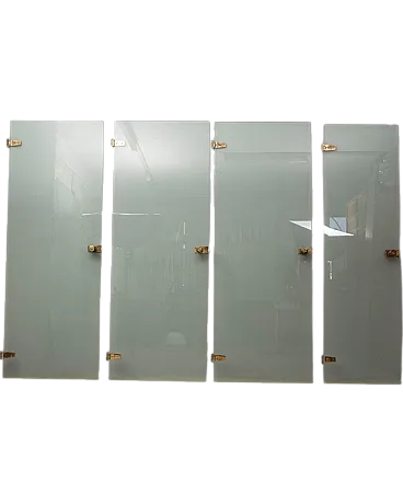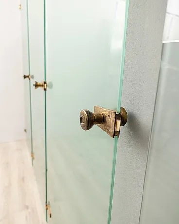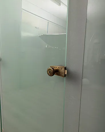 Set of four tempered glass doors with golden brass inserts and handles, supplied with key, Fontana Arte design, 1960s. Dimensions: 1) Height 219 cm; Width 80cm; Length 3cm; 2) Height 219 cm; Width 81 cm; Length 3cm; 3) Height 218 cm; Width 81 cm; Length 3cm; 4) Height 216 cm; Width 61.5 cm; Length 3cm;