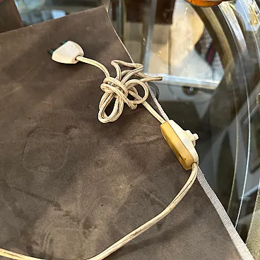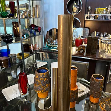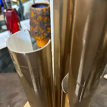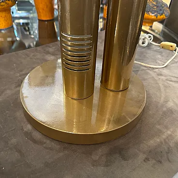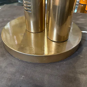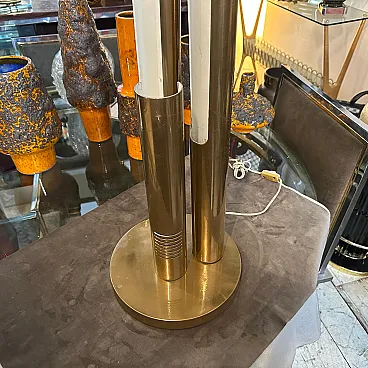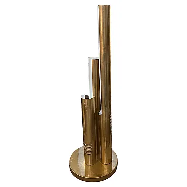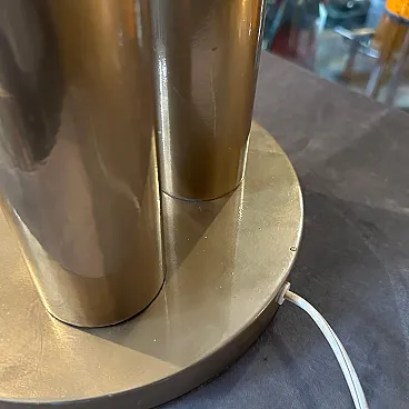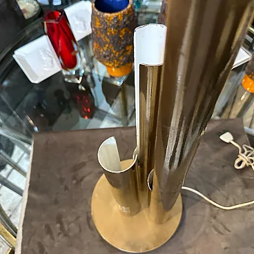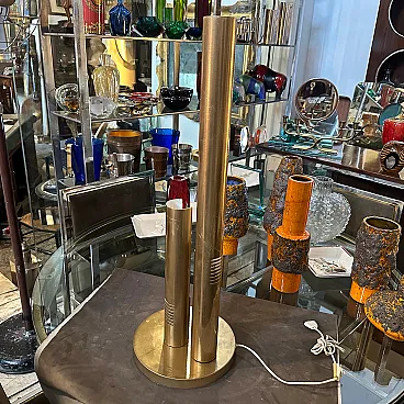 This is a 1970s Gio Ponti-style Mid-Century Modern table lamp designed and manufactured in Italy. The lamp features a gilded metal construction with a sophisticated, sculptural design. Its composition consists of cylindrical forms of varying heights, arranged on a circular base. The tallest cylinder serves as the main structural element, while the shorter ones are cut with vertical slits, adding both aesthetic and functional light-diffusing elements. The sleek gold finish gives it a luxurious and timeless appearance, reflecting the modernist principles of the era and Gio Ponti’s influence on clean, geometric forms. This piece would make an elegant addition to any interior, especially those with mid-century or modern decor themes. It's in working order and in good condition overall, it has normal signs of use and age visible on the photos.