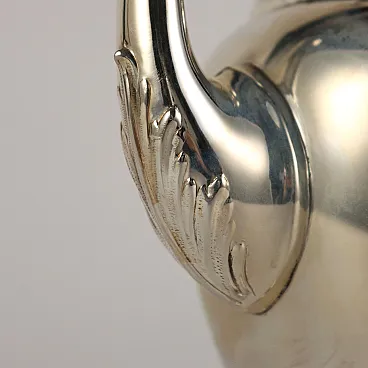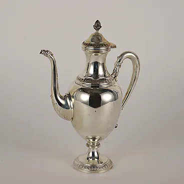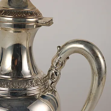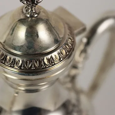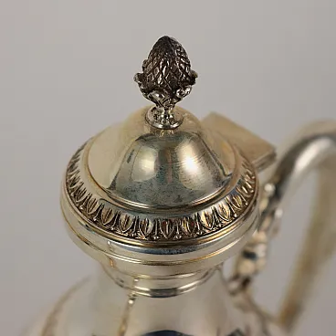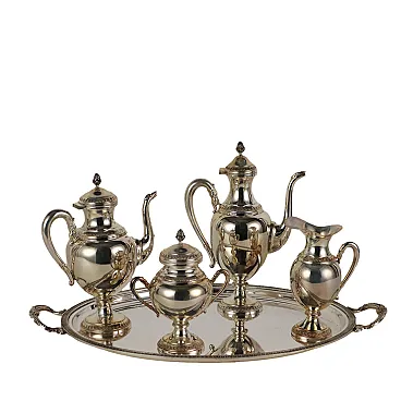 Silver tea and coffee service consisting of tray, teapot, coffee pot, sugar bowl and milk jug. Silver hallmarks under the bases, the Vicenza silversmith\'s hallmark is difficult to decipher. Grams 2415.