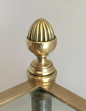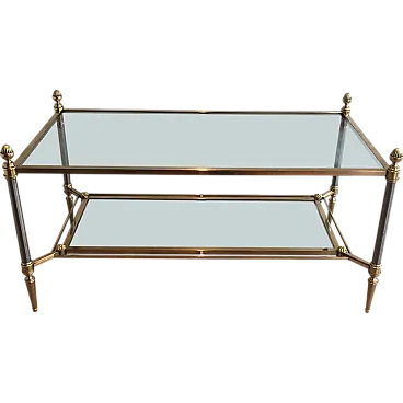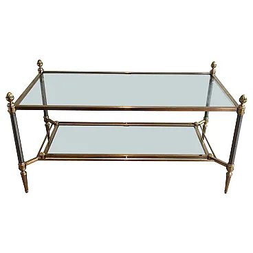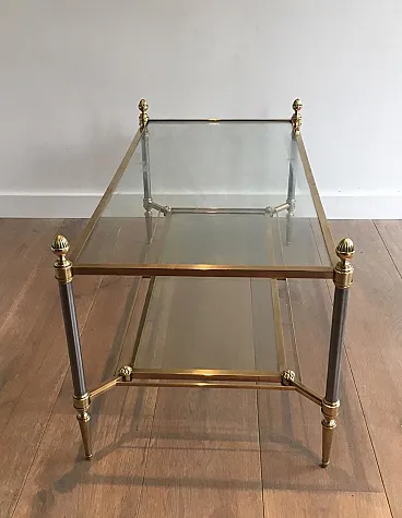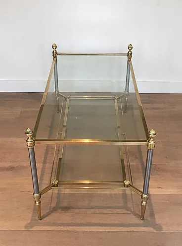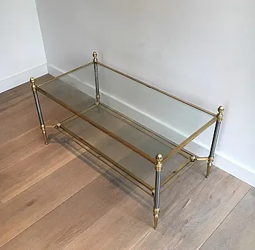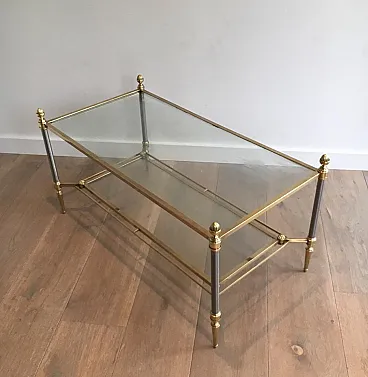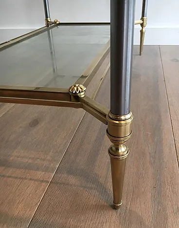 This very nice and elegant neoclassical style coffee table is made of brushed steel and brass with two glass shelves. This is a French work by Maison Jansen. Circa 1940