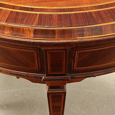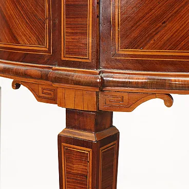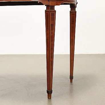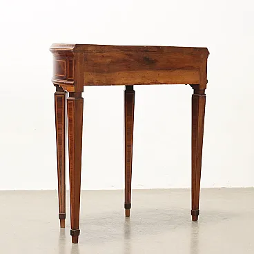 Demi-lune console in walnut veneered in bois de vioette and mahogany, maple, mahogany and boxwood fillets. Tripartite under-top band supported by four truncated pyramidal legs, joined by inlaid brackets. Restoration Genoa, last quarter of the 18th century.