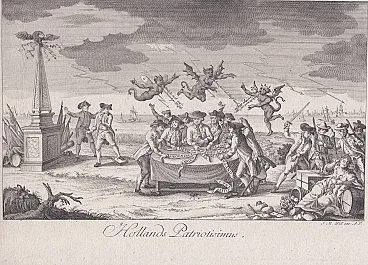 A group of Patriots is in the center around a table intent on tearing ribbons engraved with the names of the Seven United Provinces as a sign of rebellion against William V Orange-Nassau. The gesture is encouraged by three devils flying over their heads. Behind them the sea and the profile of two walled cities. On the left, on the top of an obelisk with the symbols of war at its feet, the Prussian eagle throwing lightning. In fact, in 1878 Prussia occupied Holland, William II of Prussia was the brother of Wilhelmina wife of William V Orange Nassau who was thus reinstated in his role as Captain General. On the right, a group of men threaten with swords and rifles the French rooster, who had sided with the Patriots, and a sleeping figure, an allegory of trade. The anonymous engraver suggests that the Patriots' action puts the Union at risk and threatens trade. Below the scene is engraved the title: Hollands Patriotisimus. In the lower right corner is engraved: J. M. Will exc A.V. Johan Martin Will, 1727 – 1806, was a printer and publisher active in Augsburg. Excellent impression on laid paper, wide margins beyond the edge of the copper. Excellent state of preservation.