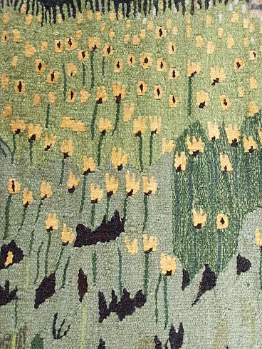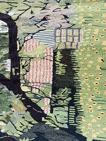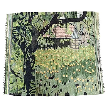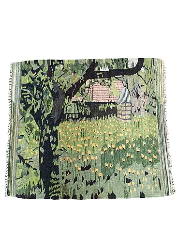 This a tapestry measuring 94 cm. x 82 cm., it is handmade with care and skill from wool. On the fabric, a lovely landscape stands out: in the center of the scene is a small country house, with a red roof, a symbol of welcome and warmth. In Front stands a tree with leaves embroidered in different shades of green, giving it depth and realism. All around it is decorated with a vibrant expanse of yellow flowers. The size of the piece makes it easy to hang on the wall, transforming any space into a window to a warm and peaceful corner of nature. European vintage.