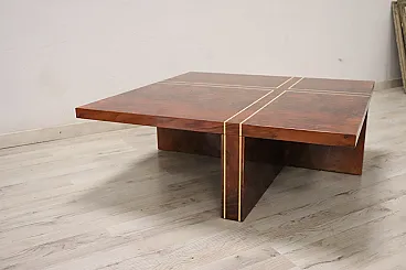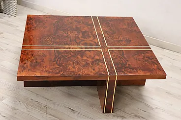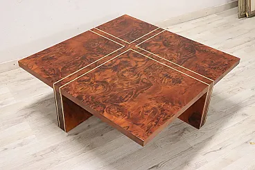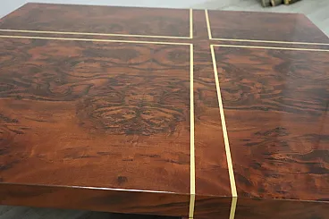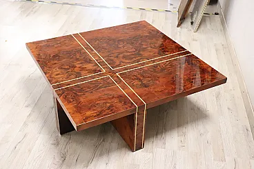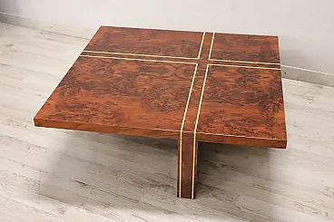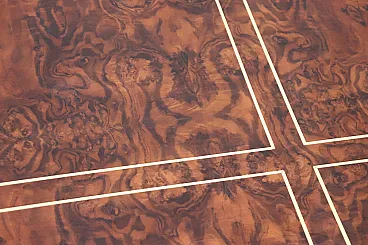 Made with walnut burl veneer and embellished with geometric inlays in light wood, this coffee table is not just a piece of furniture, but a real object of art. Its refined shape and design inspired by rationalist geometry make it perfect for enriching any contemporary environment, giving a touch of class and originality.