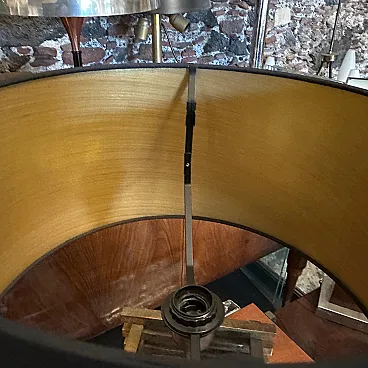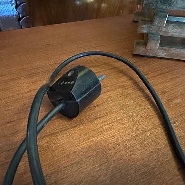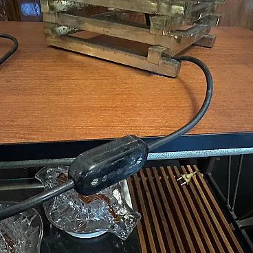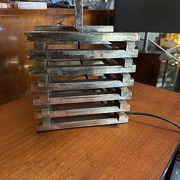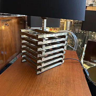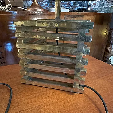 This 1970s Mid-Century Modern table lamp by Italian designer Romeo Rega is a sophisticated blend of geometry, texture, and timeless elegance. The base is crafted from brass with a distinct, architectural design comprising stacked, interlocking horizontal bars. This structural, grid-like pattern creates a bold, sculptural presence, showcasing Rega's mastery of clean, modernist aesthetics and his penchant for combining form with function. The rich patina on the brass adds depth and character, evoking a sense of vintage refinement. Topping the lamp is a sleek black drum shade with inside gold finish, which enhances the design’s dramatic appeal and contrasts beautifully with the golden tones of the base. The lamp’s proportions and clean lines make it a versatile piece, suitable for a range of interiors, from minimalist to eclectic. This lamp embodies the glamour and innovation of Romeo Rega’s iconic designs, making it a statement piece for any discerning collector or enthusiast of Mid-Century Modern design. Height without lampshade is 32 cm, it's in working order, ready to use with normal signs of use and age.