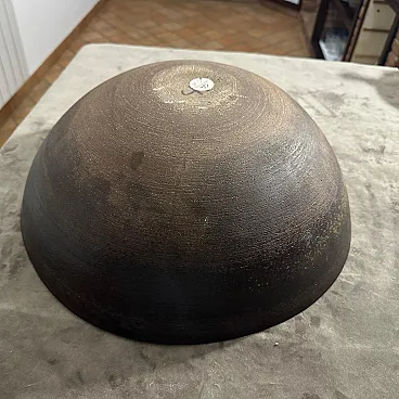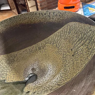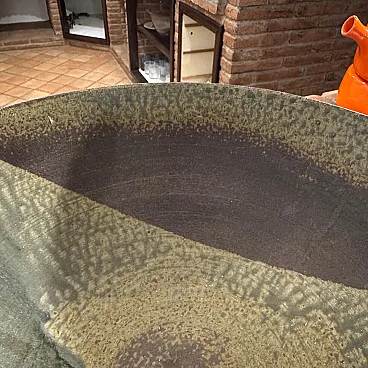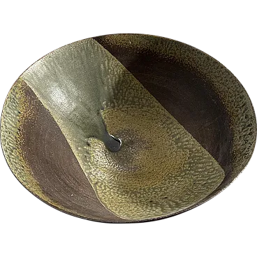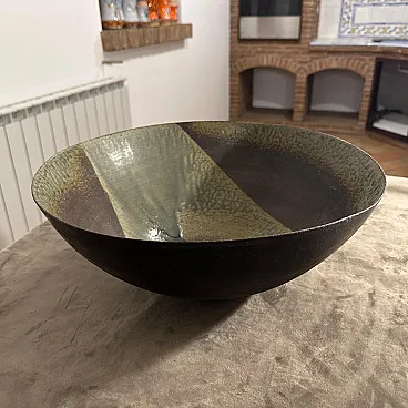 Refined centerpiece in porcelain stoneware, decorated in dark green and brown tones. Under the base, the manufacturer's trademark and paper label. "Arcore Ceramica" that was founded in 1967 by Marco and Tina Terenzi, wife of the sculptor and ceramist Nanni Valentini. Provenance: important private collection in Milan. This 1960s Organic Modern stoneware bowl by Nanni Valentini for Ceramica Arcore is a masterful expression of earthy elegance and artistic craftsmanship. The bowl's form is generously proportioned, showcasing a harmonious balance between functionality and sculptural design. The piece is defined by its dynamic glazing, with a bold interplay of natural tones including earthy browns and muted greens. A dramatic, free-flowing glaze effect sweeps across the surface, creating a sense of organic movement that highlights Valentini's ability to capture nature’s fluidity in ceramic art. The textured surface and hand-applied glaze techniques give the bowl a tactile, handcrafted quality, characteristic of the Organic Modern aesthetic. This piece reflects Valentini's dedication to material exploration and his deep connection to the natural world. Ideal as a centerpiece or a collector's item, the bowl embodies the timeless artistry of mid-century Italian design and the unique vision of Nanni Valentini.