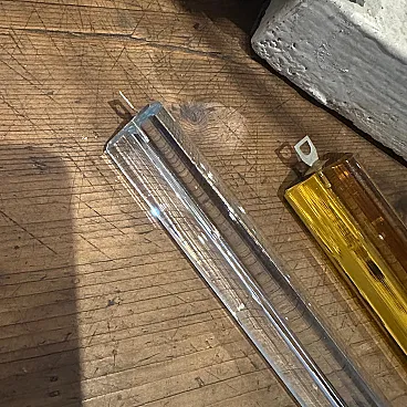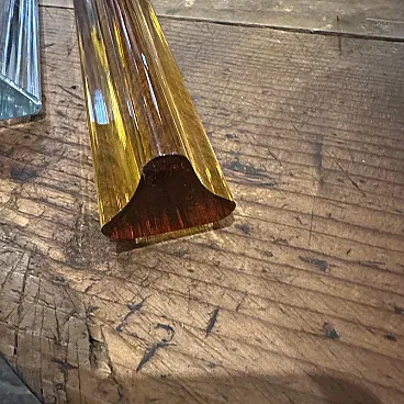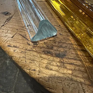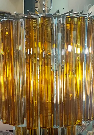 This yellow and white Murano glass trilobi cascading spiral chandelier is a stunning example of Italian craftsmanship, featuring hand-blown glass elements with a distinctive three-lobed (trilobi) design arranged in a cascading formation. These chandeliers are often associated with renowned designers like Paolo Venini, who popularized the trilobi design in the mid-20th century. The chandelier typically consists of handcrafted modules in solid crystal glass, characterized by their trilobate section, hung from a chrome-plated metal structure. The combination of yellow and white glass adds a vibrant yet elegant touch, making it a focal point in any interior setting. Genuine Murano glass pieces are highly valued for their quality and artistry. Incorporating a yellow and white Murano glass trilobi cascading chandelier into your space not only enhances its aesthetic appeal but also brings a piece of Italian art and history into your home. The chandelier is in good conditions, only the metal part has signs of use and age.