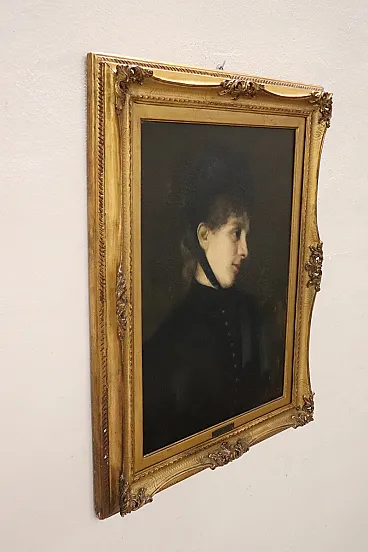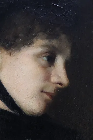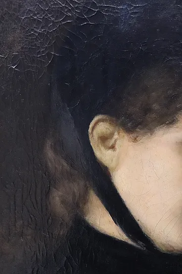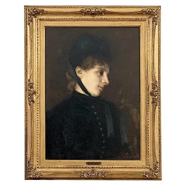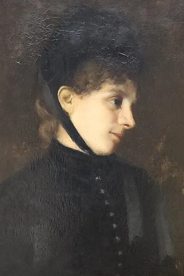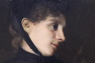 The portrait represents a young woman dressed in simple but elegant clothes, complemented by a fashionable black hat, which perfectly embodies the style of the era. The artist's choice to portray her in three-quarter view, with her head slightly bowed and a contemplative gaze, evokes a sense of mystery and introspection that invites the observer to grasp the depth of the character.