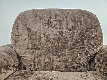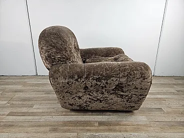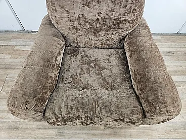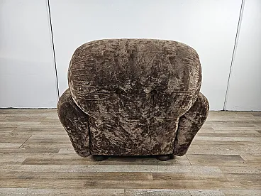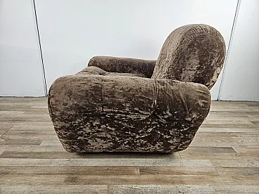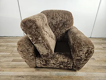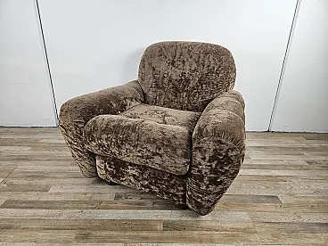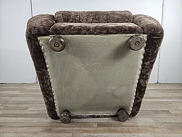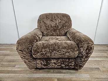 Large vintage 1960s armchair upholstered in brown fabric with wooden feet.