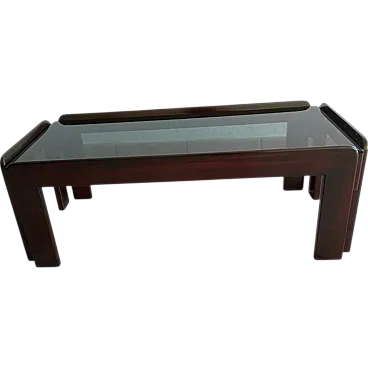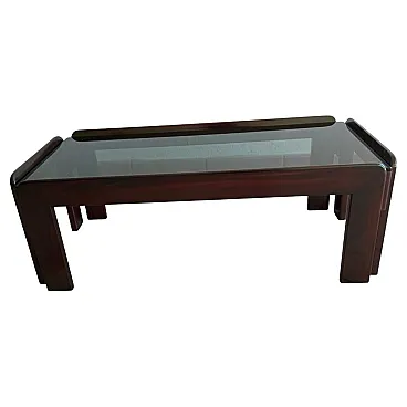 Coffee table designed by Afra (1937-2011) and Tobia (1935) Scarpa for Cassina dimensions h 36 cm. x 102 cm. x 48.5 cm., a fine example of 1960s Italian design. The smoked glass top, gives visual lightness and a sophisticated touch. The frame is made of oak wood in dark tones, with clean lines and timeless design. This is a vintage piece made by Cassina, a company that symbolizes Italian excellence in design and furniture.