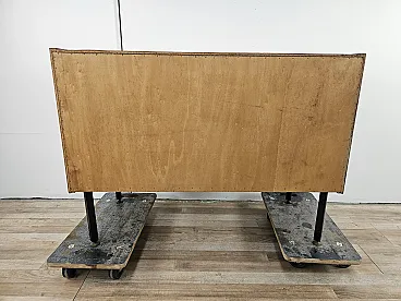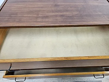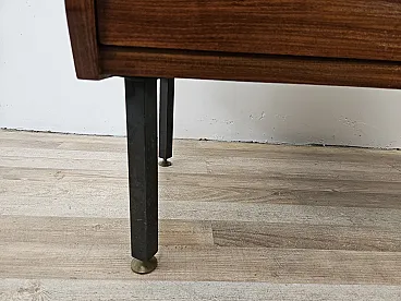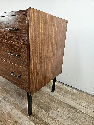 Small chest of drawers in teak wood with three large drawers and iron handles, 1970s production, Scandinavian design and adjustable in height thanks to the feet. It shows some signs of wear as shown in the photos, especially inside the drawers.