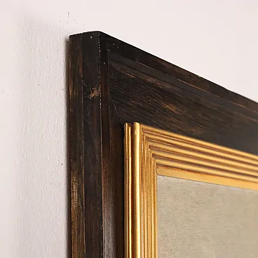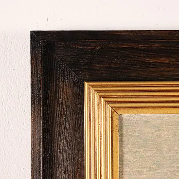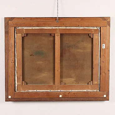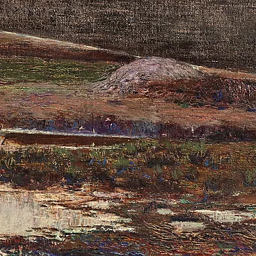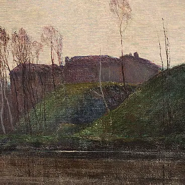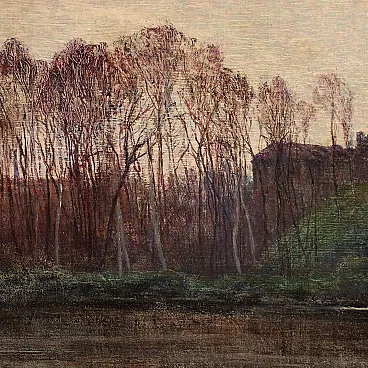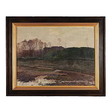 Oil painting on canvas. Signed lower left. The Roman-born artist Cesare Maggi established himself as a pointillist landscape painter, portraying alpine landscapes in the Engadine and Aosta Valley, often enlivened by the inclusion of figures and animals. Becoming a friend of the painter Giacomo Grosso in Turin in 1901, he then successfully oriented himself towards the portrait genre, setting aside the pointillist technique. While still favoring high mountain views, he broadened his subjects by also engaging in seascapes and still lifes. In this work, still from the first period, Maggi portrays a glimpse of the countryside crossed by a calm river, bordered by rows of bare trees and small grassy hills, behind which the farmhouses overlook: already no longer linked to the techniques divisionist, the work is rather characterized by dense and opaque mixtures of color, in which the earth, the water and the farmhouses are superimposed in a continuum broken only by the band of sky above. The work is presented in a period frame.