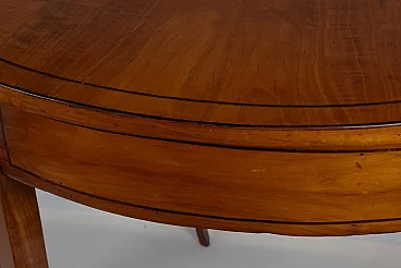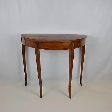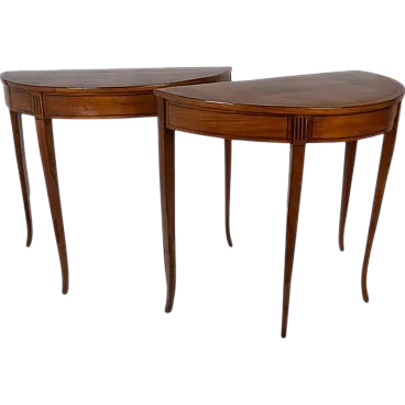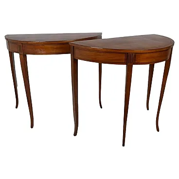 Pair of small and elegant half-moon console tables, made of cherry wood, characterized by an understated and elegant aesthetic typical of the Directoire period (early 19th century). The dimensions: width 92 cm, depth 49 cm, hight cm. 81. The top and band of the consoles feature a linear decorative pattern, highlighted by a dark fillet that adds a contrasting touch to the warmth of the cherry wood. The slightly wavy legs lend a sense of lightness and harmony to the whole. A distinctive example of early 19th-century Italian craftsmanship.