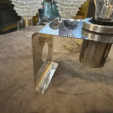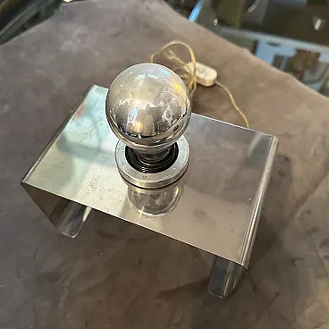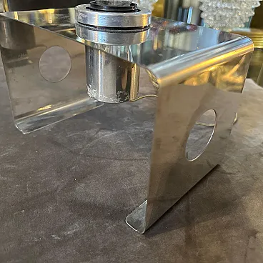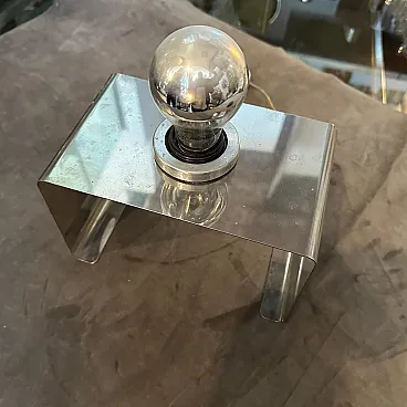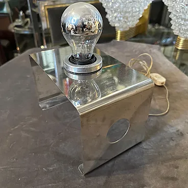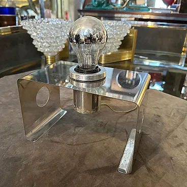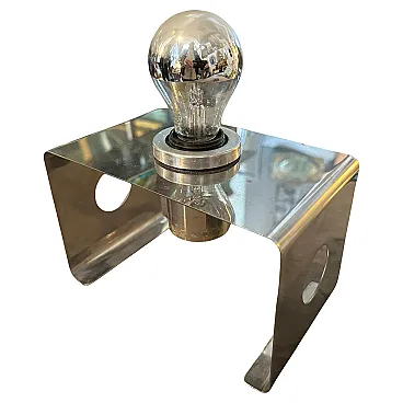 This Italian Table Lamp embodies the era’s playful yet forward-thinking approach to design. Its bold geometry and minimalist aesthetic are hallmark traits of Space Age and modernist lighting designs from Italy during that time. The lamp features a bent metal frame shaped into a U-like form with clean, angular lines, emphasizing simplicity and functionalism. The metallic bulb holder in the center complements the lamp's modernist aesthetic, leaving the light bulb fully exposed for a raw, industrial look. This reflects Space Age design’s fascination with technology and innovation. The side panels of the lamp include circular cutouts, adding a decorative yet functional element because it's possible use them tochange the position of bulb holder The lamp is constructed from durable metal. Its small footprint makes it ideal for desks, bedside tables, or shelves, providing direct, focused light. Italian designers were at the forefront of Space Age design, combining playful aesthetics with high-quality materials. The lamp bridges mid-century modern functionality with 1970s futurism, appealing to both design purists and those seeking bold, retro pieces. This lamp is a beautiful example of 1970s Italian design, showcasing a blend of artistry, innovation, and functionalism that makes it a collector’s item for vintage lighting enthusiasts.
