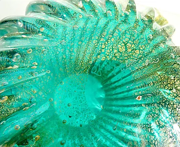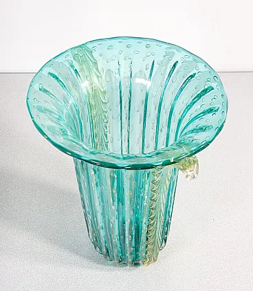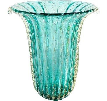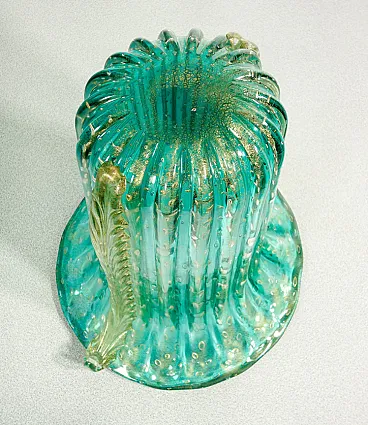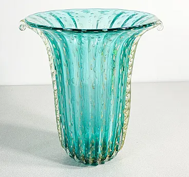 TOSO Murano design collector's vase, in bullicante green blown glass, edged with golden flakes. Bullicante blown glass, creased with golden flakes.