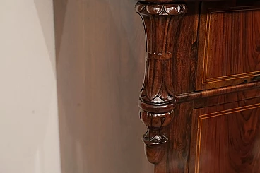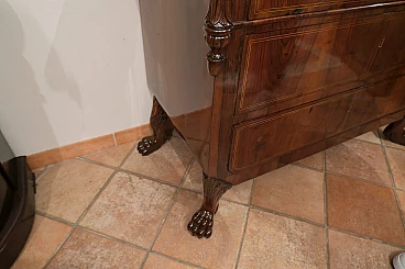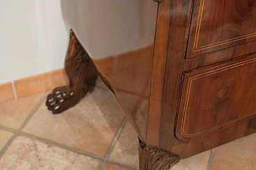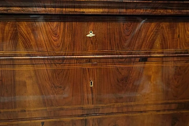 Empire chest of drawers Lucchese belonging to the early '800 entirely plated in walnut briar with maple fillets and rounded sides commonly called crossbow. Restored by our master craftsmen with traditional shellac and alcohol method. Lucca early nineteenth century. Certificate of Authenticity.