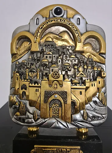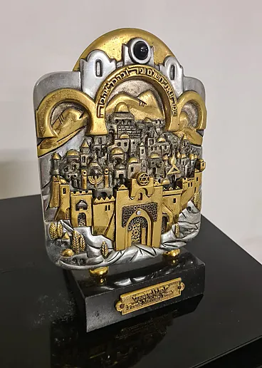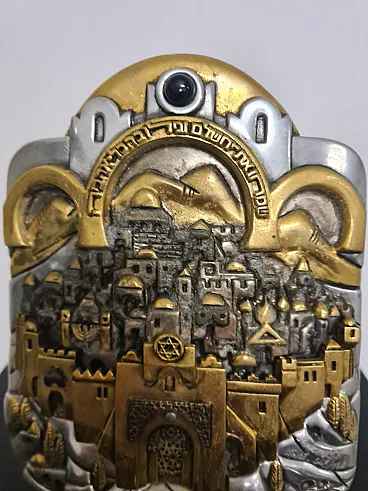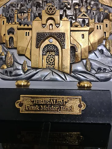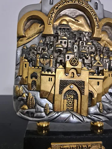 Depicting on the front the walls and gates of the city of Jerusalem, the buildings within them, the Temple Mount and the hills around the city walls.