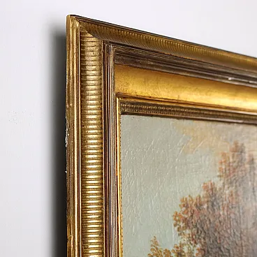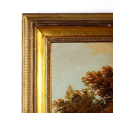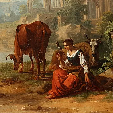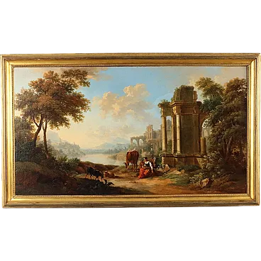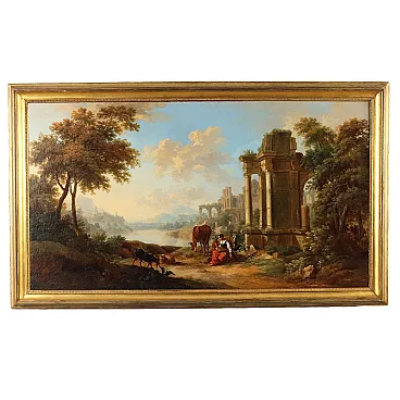 Oil on canvas. Signed \" Schütz fecit\" on the ruin to the right of the shepherdess. Christian Georg Schütz the Elder captures an idyllic and serene landscape, crossed by a winding and slow river; on the right bank stand some architectural ruins of classical structures, while in the foreground, seated in the center, serene and composed, a shepherdess spins wool while watching over her small flock of goats and cows. The painting is a hymn to nature, where the naturalistic elements, the earth, the sky, the river meet to form a harmonious and balanced scene, pervaded by pink light, in which the living figures and the architectural remains fit in with balance and calm. Schütz mainly painted river views of the Rhine and the Main, places he inhabited, and worked for important German clients, nobles and prelates. The painting has participated in several art auctions. Restored and relined, it is presented in a period frame.