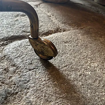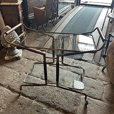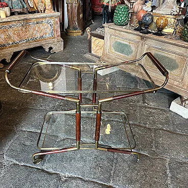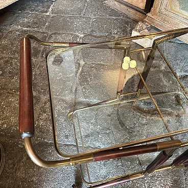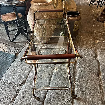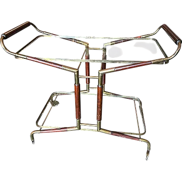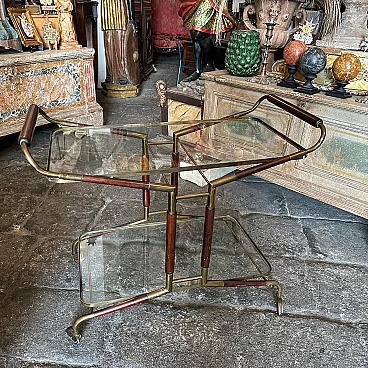 This is a mid-century modern bar cart designed by Cesare Lacca and manufactured in Italy in the 1950s. The design features an elegant combination of materials, including solid brass in original patina, glass, and mahogany wood. The frame is primarily made of brass with warm wooden accents, creating a stylish and sophisticated contrast. The cart consists of two tiers of glass shelves, providing space for serving and displaying items or barware and bottles. It is supported by slender brass legs with curved handles for ease of movement, and small wheels at the base add functionality for portability. The refined craftsmanship and timeless aesthetic make this piece an iconic example of mid-century modern design. Cesare Lacca was a prominent Italian architect and designer, celebrated for his modernist furniture creations during the 1950s. He is particularly renowned for his elegant serving trolleys, coffee tables, and magazine racks, which often feature a harmonious blend of materials such as teak, glass, and brass.