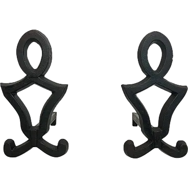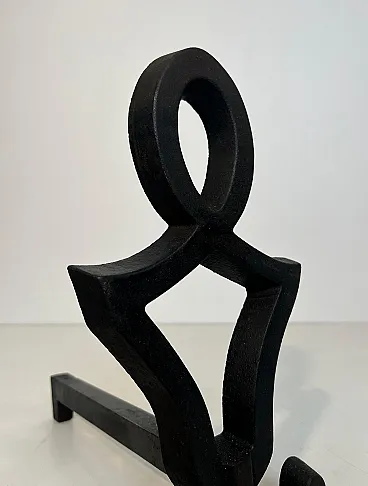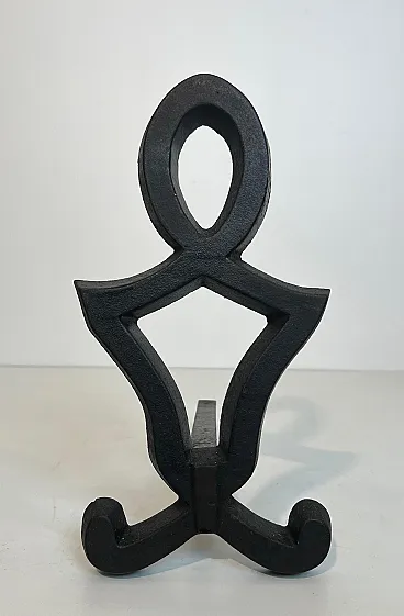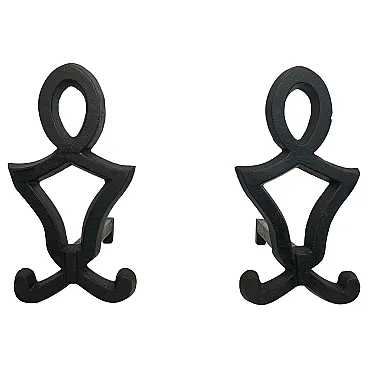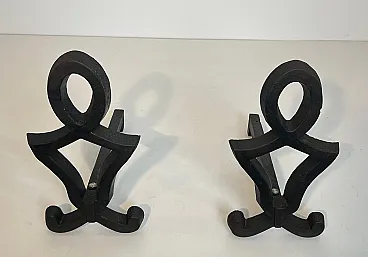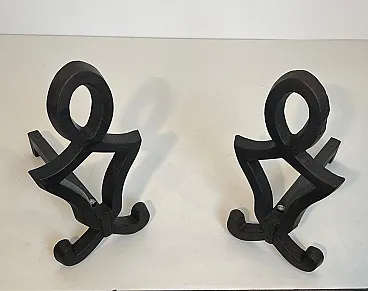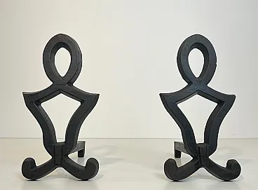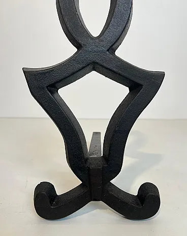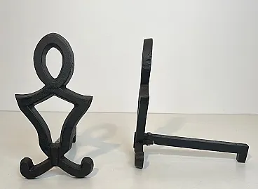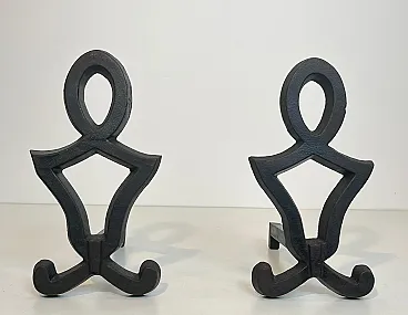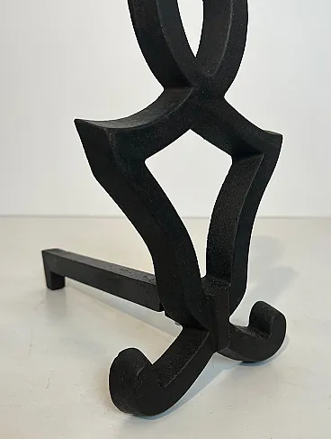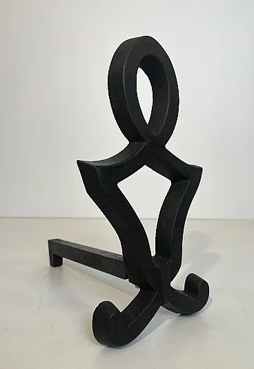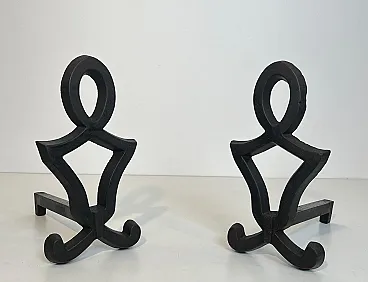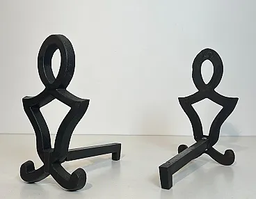 This very nice pair of modernist andirons is made of cast iron and wrought iron. This is a French work by Raymond Subes. Circa 1940