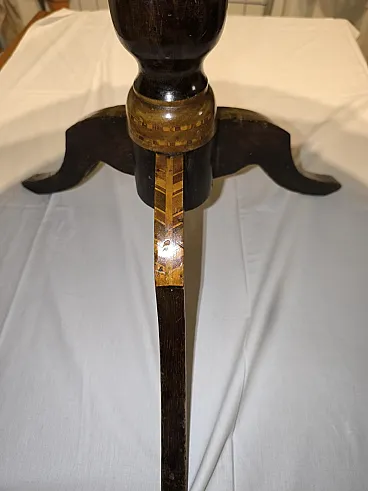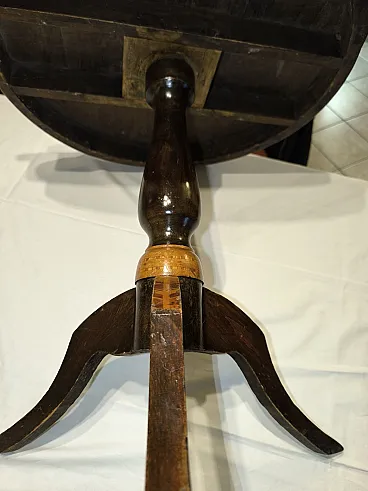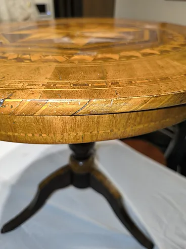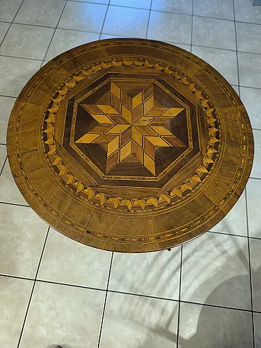 Living room table with geometric inlays on the top and on the stem. The inlays are made with the "Toppo" darkened technique, a processing commonly used in Italy throughout the nineteenth century. This processing consisted in chaooling each other wooden strips of different essences and after cutting the blocks obtained, exploiting the chromatic difference of the sections to create various geometric shapes with which to decorate the surfaces. The round floor rests on a central leg supported by three feet. Restored and polished with shellac.